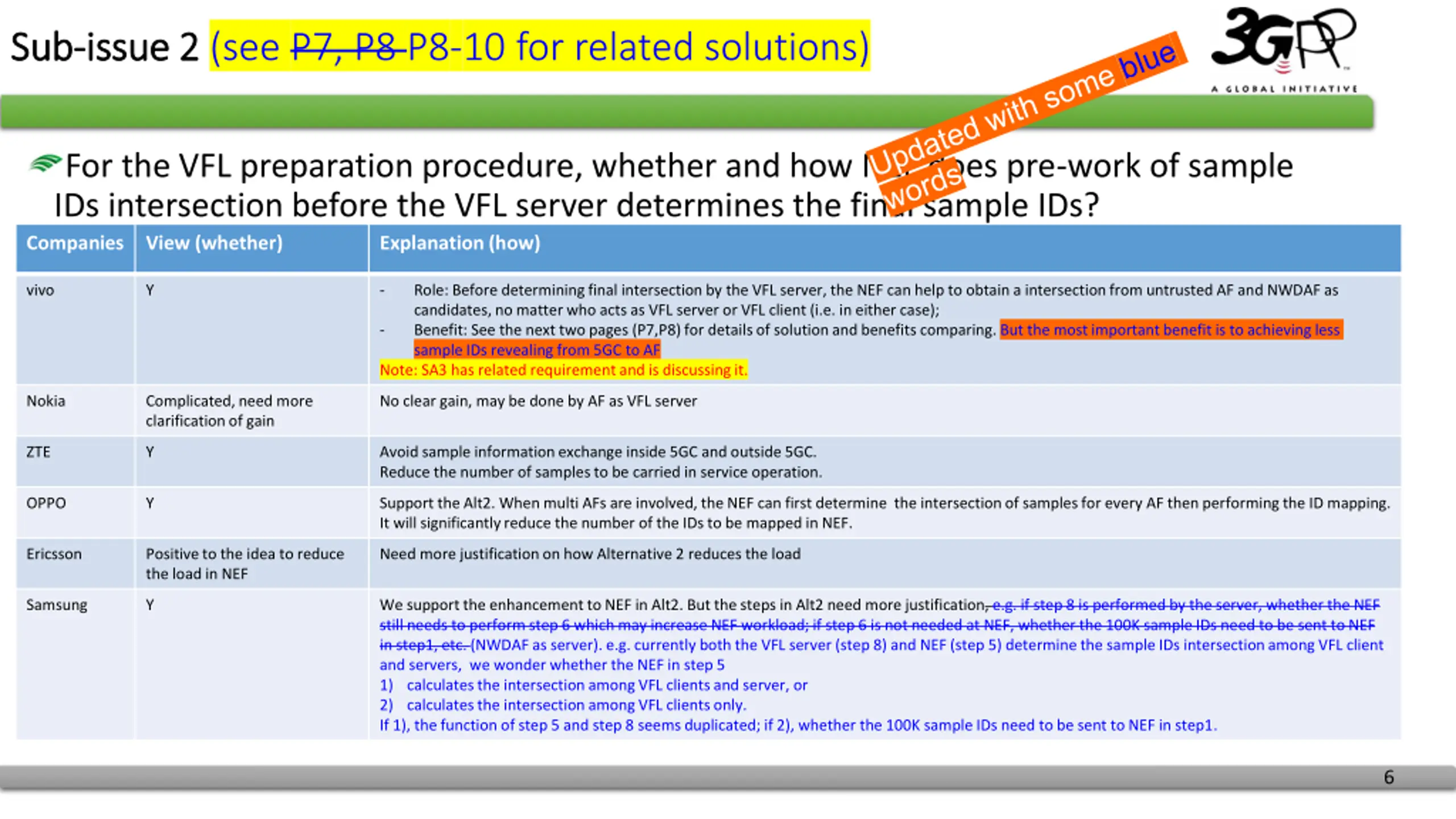 Sub Sub- -issue 2 issue 2 (see P7, P8 P8-10 for related solutions) For the VFL preparation procedure, whether and how NEF does pre-work of sample IDs intersection before the VFL server determines the final sample IDs? Companies View (whether) Explanation (how) vivo Y - Role: Before determining final intersection by the VFL server, the NEF can help to obtain a intersection from untrusted AF and NWDAF as candidates, no matter who acts as VFL server or VFL client (i.e. in either case); Benefit: See the next two pages (P7,P8) for details of solution and benefits comparing. But the most important benefit is to achieving less sample IDs revealing from 5GC to AF Note: SA3 has related requirement and is discussing it. - Nokia Complicated, need more clarification of gain No clear gain, may be done by AF as VFL server ZTE Y Avoid sample information exchange inside 5GC and outside 5GC. Reduce the number of samples to be carried in service operation. OPPO Y Support the Alt2. When multi AFs are involved, the NEF can first determine the intersection of samples for every AF then performing the ID mapping. It will significantly reduce the number of the IDs to be mapped in NEF. Ericsson Positive to the idea to reduce the load in NEF Need more justification on how Alternative 2 reduces the load Samsung Y We support the enhancement to NEF in Alt2. But the steps in Alt2 need more justification, e.g. if step 8 is performed by the server, whether the NEF still needs to perform step 6 which may increase NEF workload; if step 6 is not needed at NEF, whether the 100K sample IDs need to be sent to NEF in step1, etc. (NWDAF as server). e.g. currently both the VFL server (step 8) and NEF (step 5) determine the sample IDs intersection among VFL client and servers, we wonder whether the NEF in step 5 1) calculates the intersection among VFL clients and server, or 2) calculates the intersection among VFL clients only. If 1), the function of step 5 and step 8 seems duplicated; if 2), whether the 100K sample IDs need to be sent to NEF in step1. 6