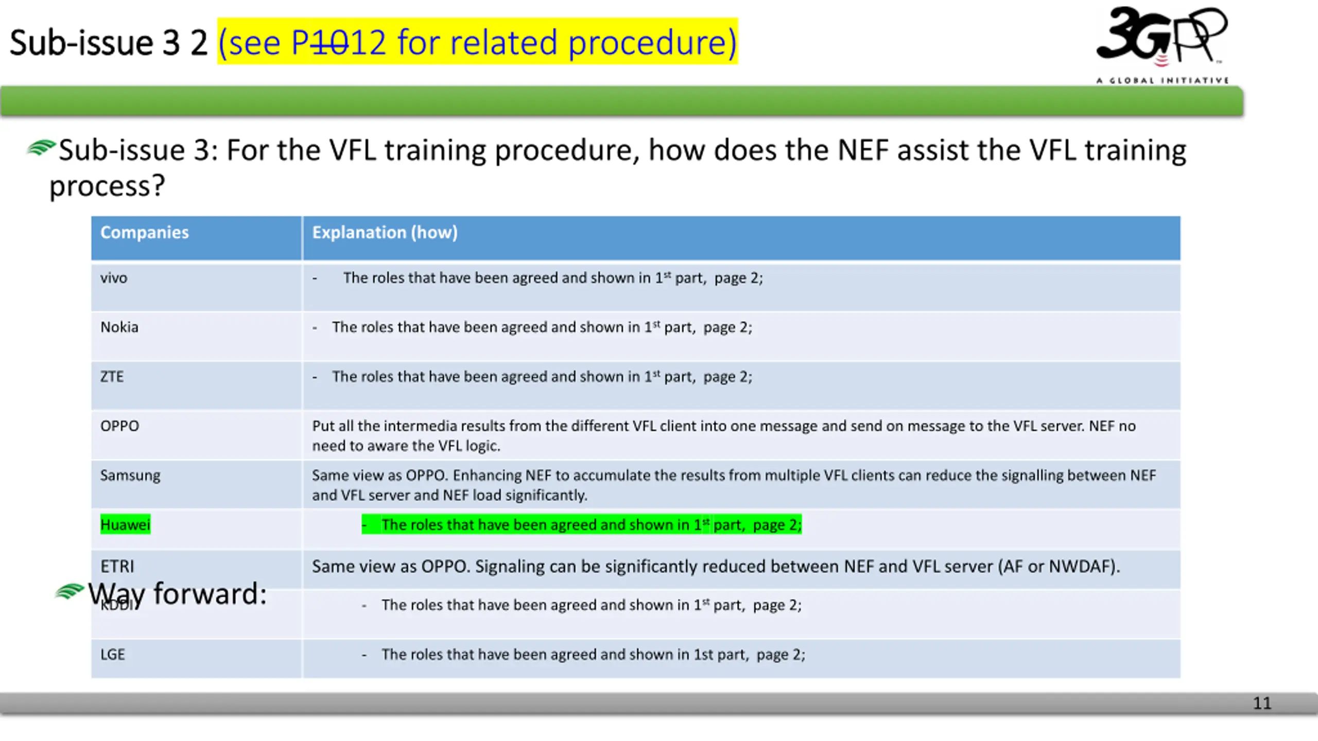 Sub Sub- -issue 3 2 issue 3 2 (see P1012 for related procedure) Sub-issue 3: For the VFL training procedure, how does the NEF assist the VFL training process? Companies Explanation (how) The roles that have been agreed and shown in 1st part, page 2; vivo - - The roles that have been agreed and shown in 1st part, page 2; Nokia - The roles that have been agreed and shown in 1st part, page 2; ZTE OPPO Put all the intermedia results from the different VFL client into one message and send on message to the VFL server. NEF no need to aware the VFL logic. Samsung Same view as OPPO. Enhancing NEF to accumulate the results from multiple VFL clients can reduce the signalling between NEF and VFL server and NEF load significantly. The roles that have been agreed and shown in 1stpart, page 2; Huawei - ETRI Way forward: Same view as OPPO. Signaling can be significantly reduced between NEF and VFL server (AF or NWDAF). - The roles that have been agreed and shown in 1st part, page 2; KDDI LGE - The roles that have been agreed and shown in 1st part, page 2; 11