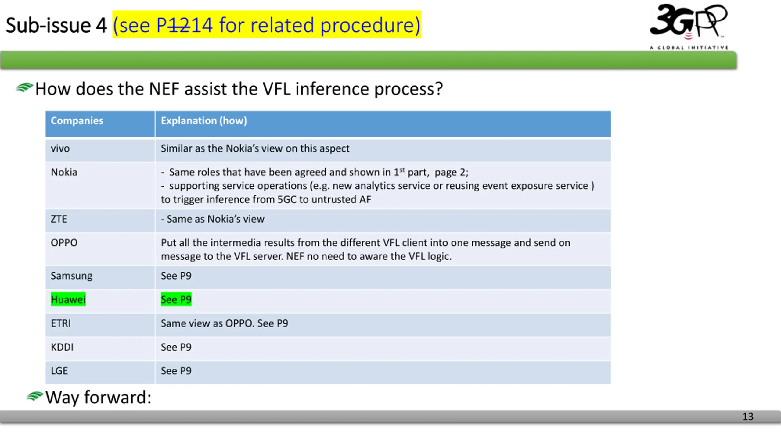 Sub Sub- -issue 4 issue 4 (see P1214 for related procedure) How does the NEF assist the VFL inference process? Companies Explanation (how) vivo Similar as the Nokia s view on this aspect - Same roles that have been agreed and shown in 1st part, page 2; - supporting service operations (e.g. new analytics service or reusing event exposure service ) to trigger inference from 5GC to untrusted AF Nokia ZTE - Same as Nokia s view OPPO Put all the intermedia results from the different VFL client into one message and send on message to the VFL server. NEF no need to aware the VFL logic. Samsung See P9 Huawei See P9 ETRI Same view as OPPO. See P9 KDDI See P9 LGE See P9 Way forward: 13