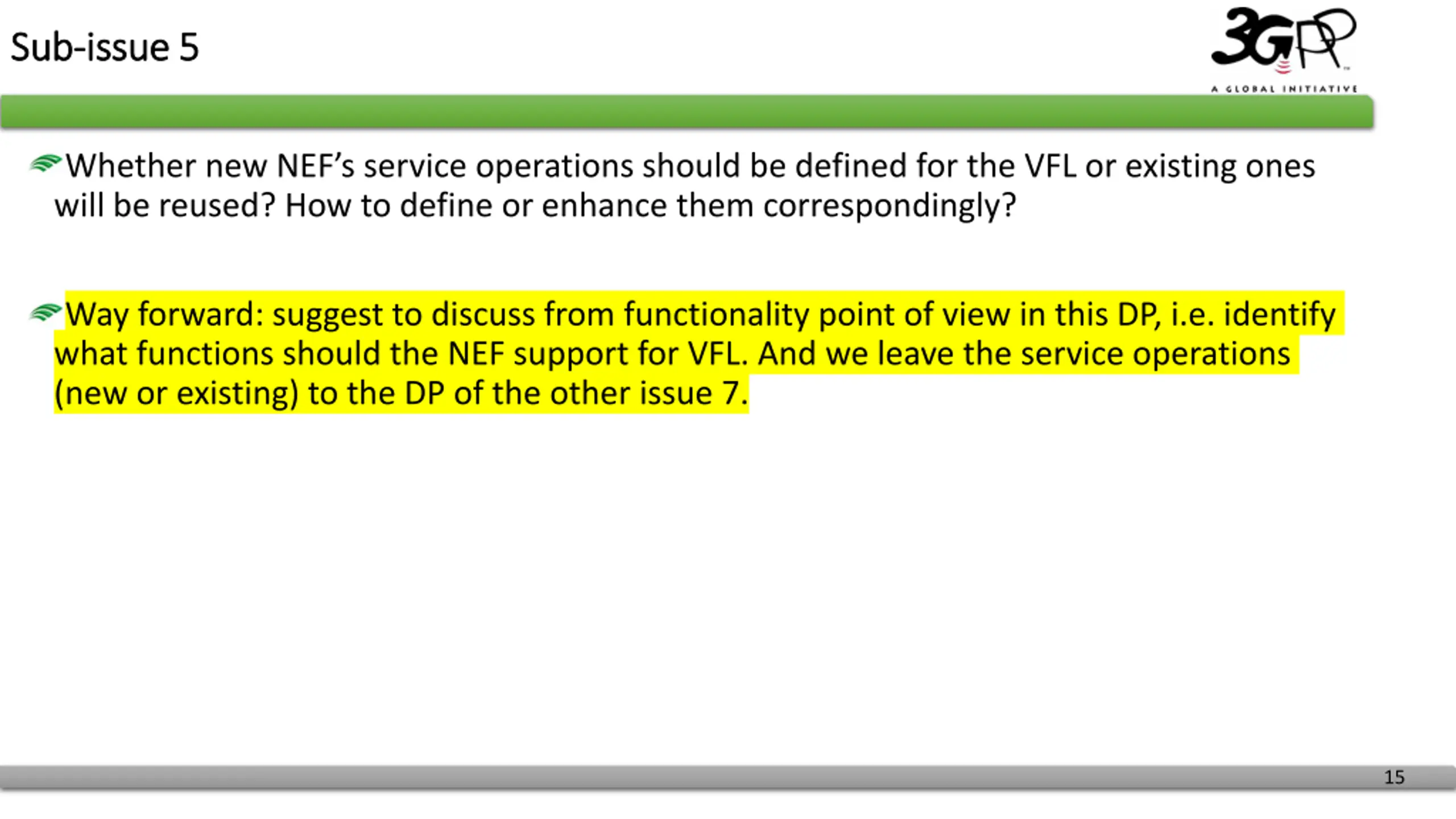 Sub Sub- -issue 5 issue 5 Whether new NEF s service operations should be defined for the VFL or existing ones will be reused? How to define or enhance them correspondingly? Way forward: suggest to discuss from functionality point of view in this DP, i.e. identify what functions should the NEF support for VFL. And we leave the service operations (new or existing) to the DP of the other issue 7. 15
