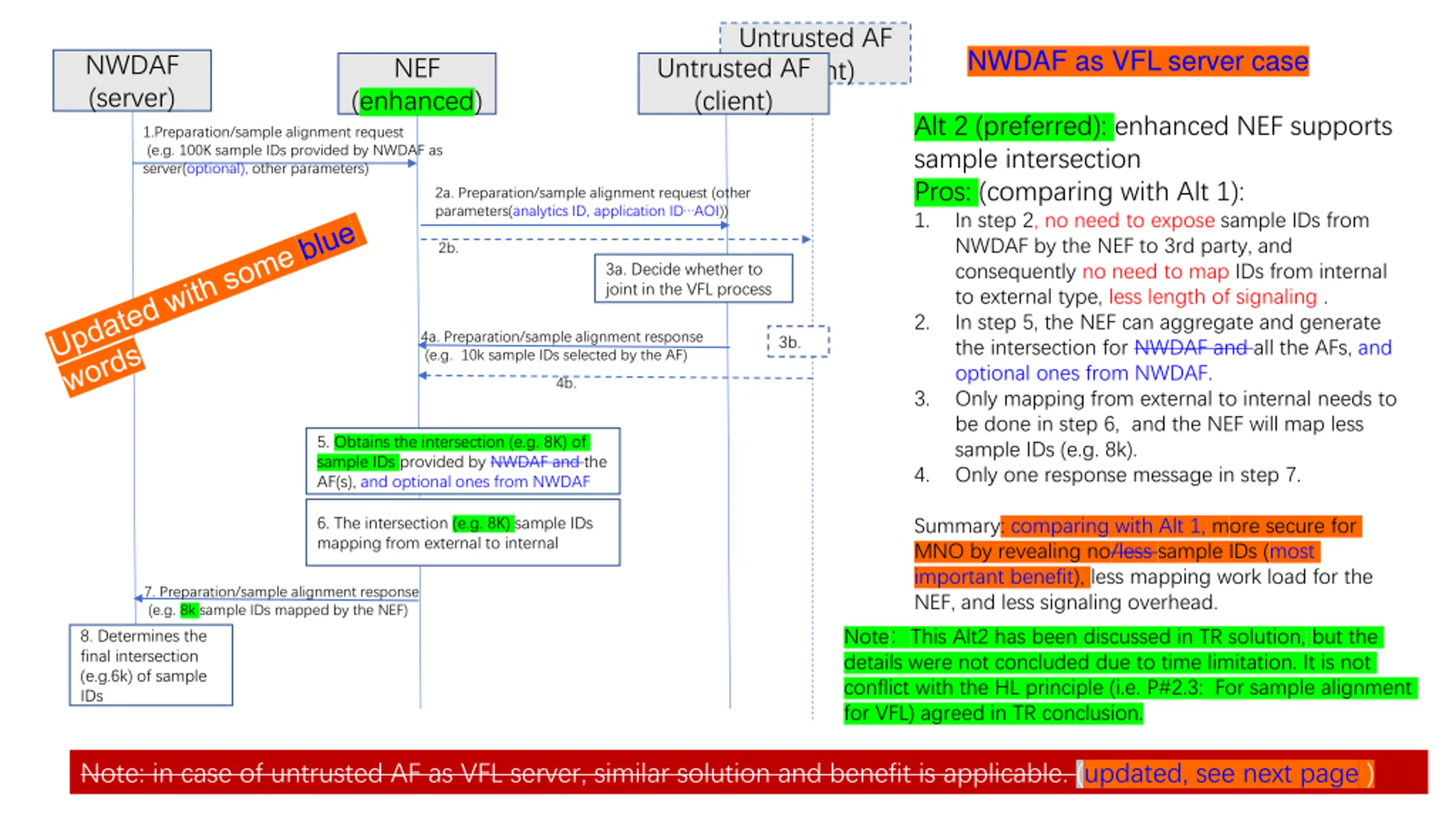 Untrusted AF (client) (client) NWDAF as VFL server case NWDAF (server) NEF Untrusted AF (enhanced) Alt 2 (preferred): enhanced NEF supports sample intersection Pros: (comparing with Alt 1): 1. In step 2, no need to expose sample IDs from NWDAF by the NEF to 3rd party, and consequently no need to map IDs from internal to external type, less length of signaling . 2. In step 5, the NEF can aggregate and generate the intersection for NWDAF and all the AFs, and optional ones from NWDAF. 3. Only mapping from external to internal needs to be done in step 6, and the NEF will map less sample IDs (e.g. 8k). 4. Only one response message in step 7. 1.Preparation/sample alignment request (e.g. 100K sample IDs provided by NWDAF as server(optional), other parameters) 2a. Preparation/sample alignment request (other parameters(analytics ID, application ID AOI)) 2b. 3a. Decide whether to joint in the VFL process 4a. Preparation/sample alignment response (e.g. 10k sample IDs selected by the AF) 3b. 4b. 5. Obtains the intersection (e.g. 8K) of sample IDs provided by NWDAF and the AF(s), and optional ones from NWDAF 6. The intersection (e.g. 8K) sample IDs mapping from external to internal Summary: comparing with Alt 1, more secure for MNO by revealing no/less sample IDs (most important benefit), less mapping work load for the NEF, and less signaling overhead. 7. Preparation/sample alignment response (e.g. 8k sample IDs mapped by the NEF) Note This Alt2 has been discussed in TR solution, but the details were not concluded due to time limitation. It is not conflict with the HL principle (i.e. P#2.3: For sample alignment for VFL) agreed in TR conclusion. 8. Determines the final intersection (e.g.6k) of sample IDs Note: in case of untrusted AF as VFL server, similar solution and benefit is applicable. (updated, see next page )