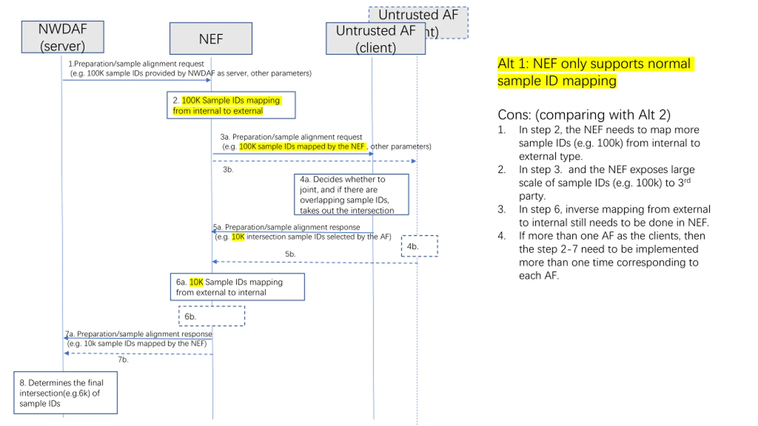 Untrusted AF (client) (client) NWDAF (server) Untrusted AF NEF Alt 1: NEF only supports normal sample ID mapping 1.Preparation/sample alignment request (e.g. 100K sample IDs provided by NWDAF as server, other parameters) 2. 100K Sample IDs mapping from internal to external Cons: (comparing with Alt 2) 1. In step 2, the NEF needs to map more sample IDs (e.g. 100k) from internal to external type. 2. In step 3. and the NEF exposes large scale of sample IDs (e.g. 100k) to 3rd party. 3. In step 6, inverse mapping from external to internal still needs to be done in NEF. 4. If more than one AF as the clients, then the step 2-7 need to be implemented more than one time corresponding to each AF. 3a. Preparation/sample alignment request (e.g. 100K sample IDs mapped by the NEF , other parameters) 3b. 4a. Decides whether to joint, and if there are overlapping sample IDs, takes out the intersection 5a. Preparation/sample alignment response (e.g. 10K intersection sample IDs selected by the AF) 4b. 5b. 6a. 10K Sample IDs mapping from external to internal 6b. 7a. Preparation/sample alignment response (e.g. 10k sample IDs mapped by the NEF) 7b. 8. Determines the final intersection(e.g.6k) of sample IDs