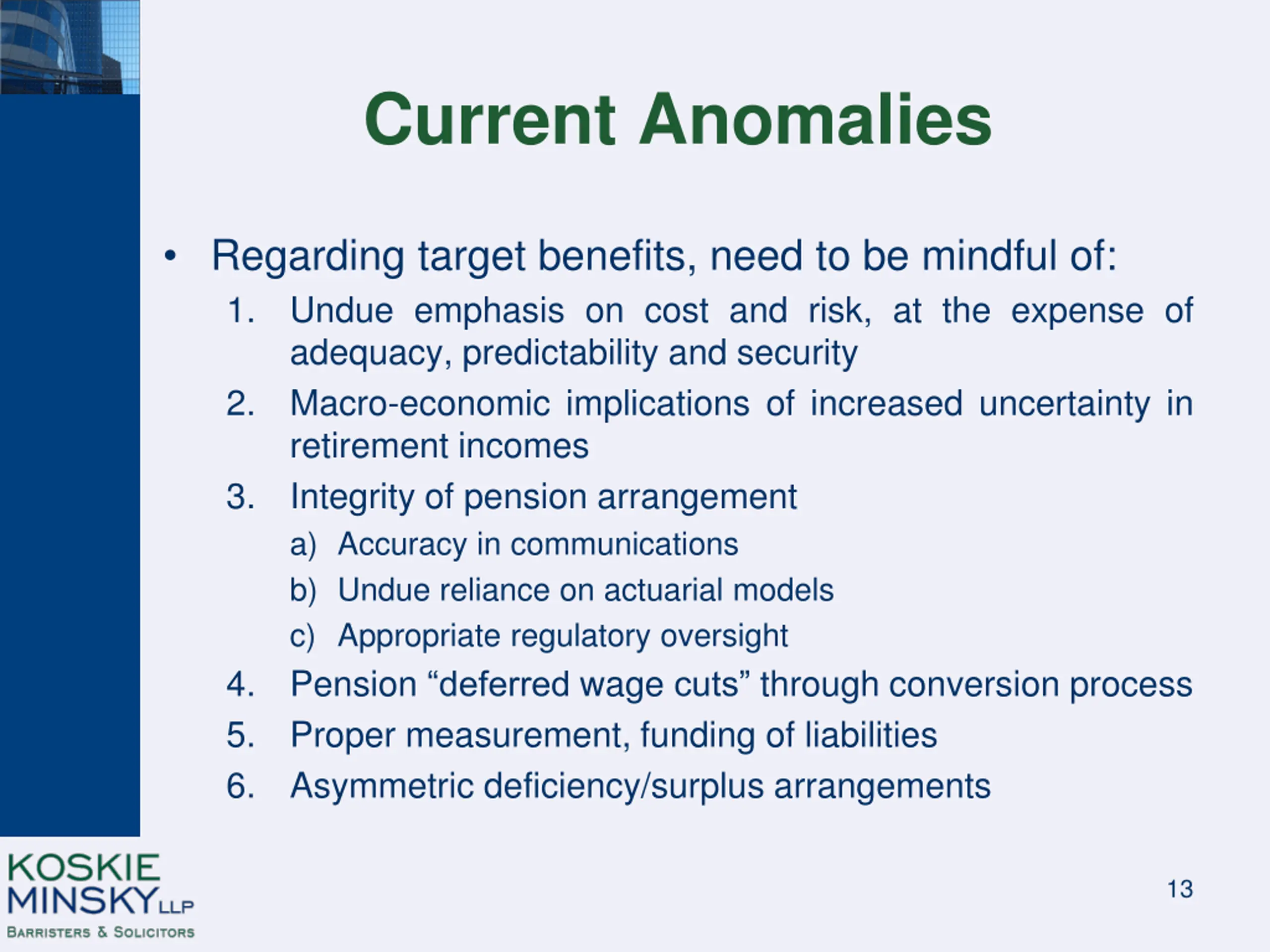 Current Anomalies Regarding target benefits, need to be mindful of: 1. Undue emphasis on cost and risk, at the expense of adequacy, predictability and security 2. Macro-economic implications of increased uncertainty in retirement incomes 3. Integrity of pension arrangement a) Accuracy in communications b) Undue reliance on actuarial models c) Appropriate regulatory oversight 4. Pension deferred wage cuts through conversion process 5. Proper measurement, funding of liabilities 6. Asymmetric deficiency/surplus arrangements 13
