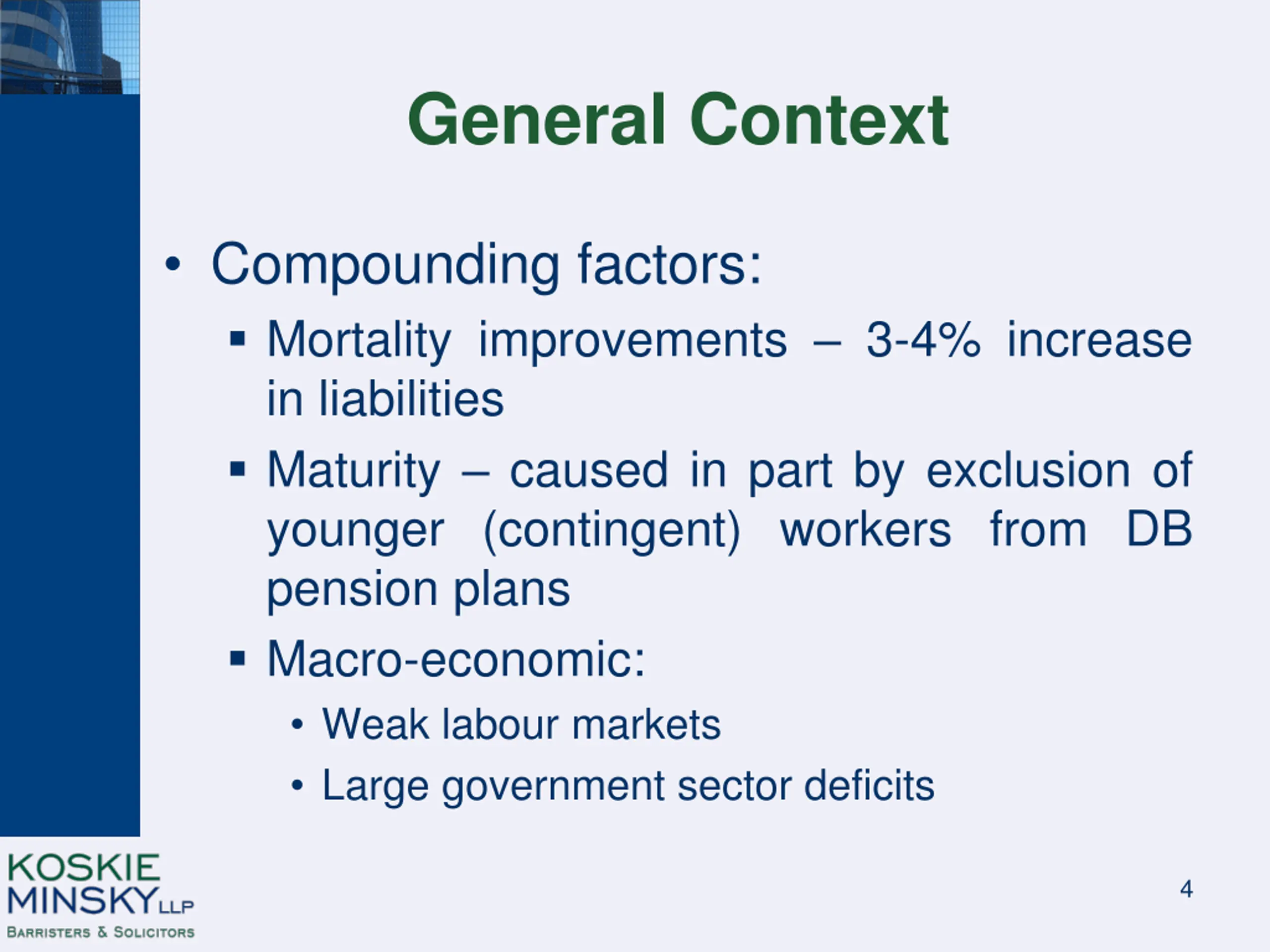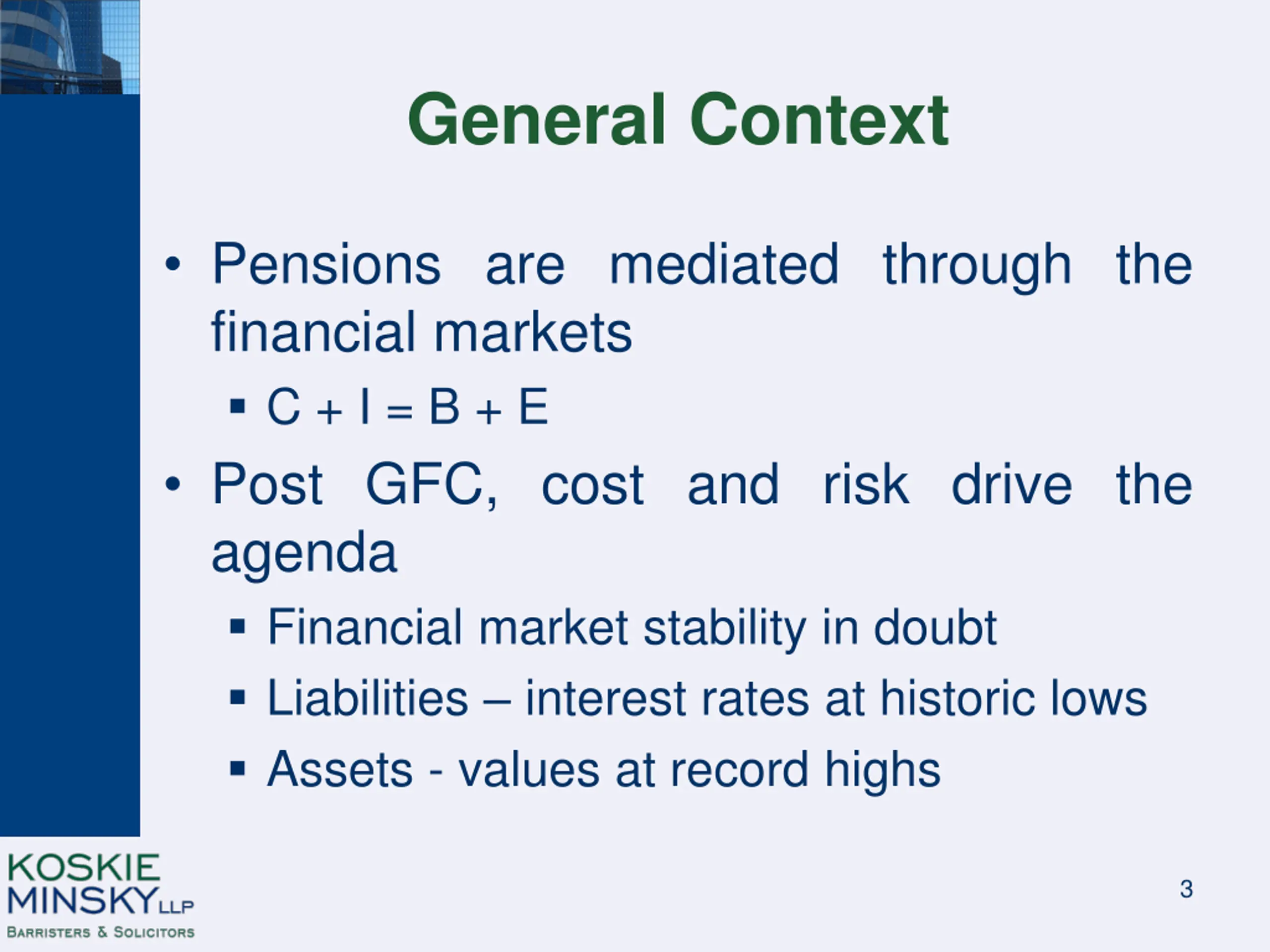 General Context Pensions a balance between: Adequacy, predictability and security; Cost and risk Balance has multiple dimensions: Member quality of life Employer survival constraint Macro-economic aggregate demand Political middle class status, pension 2