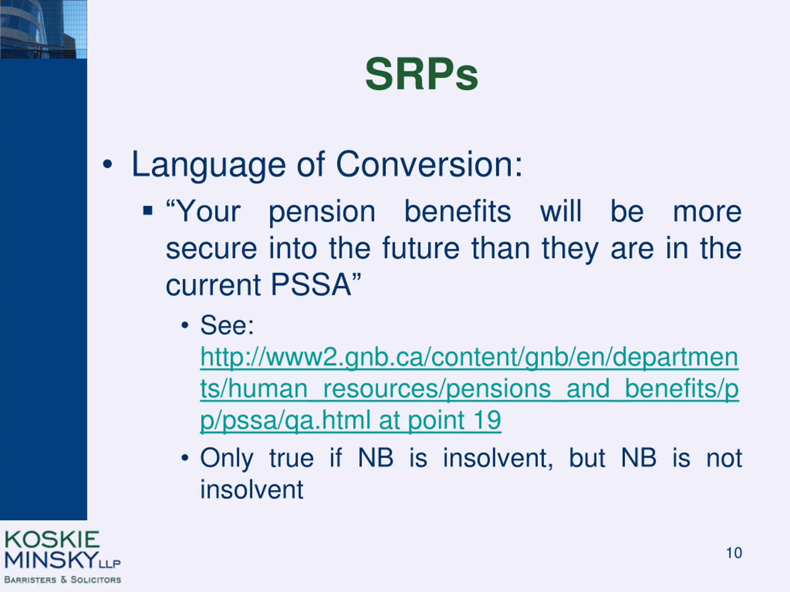 SRPs Language of Conversion: Your pension benefits will be more secure into the future than they are in the current PSSA See: http://www2.gnb.ca/content/gnb/en/departmen ts/human_resources/pensions_and_benefits/p p/pssa/qa.html at point 19 Only true if NB is insolvent, but NB is not insolvent 10