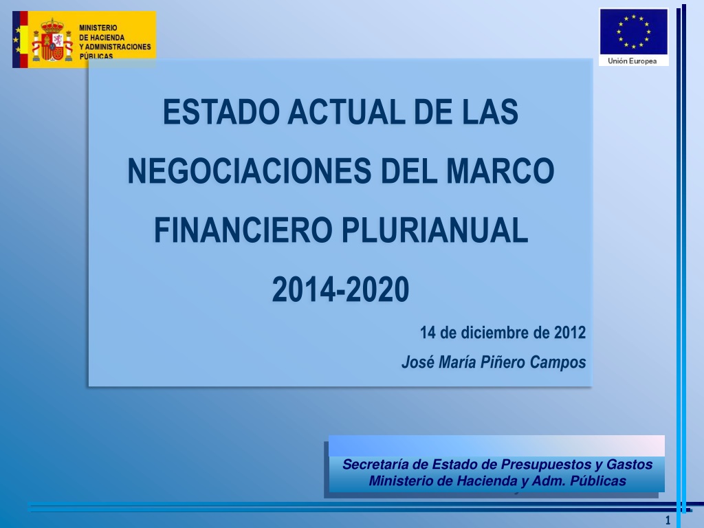 ESTADO ACTUAL DE LAS NEGOCIACIONES DEL MARCO FINANCIERO PLURIANUAL 2014-2020 14 de diciembre de 2012 Jos Mar a Pi ero Campos Direcci n General de Fondos Comunitarios Secretar a de Estado de Presupuestos y Gastos Ministerio de Hacienda y Adm. P blicas 1