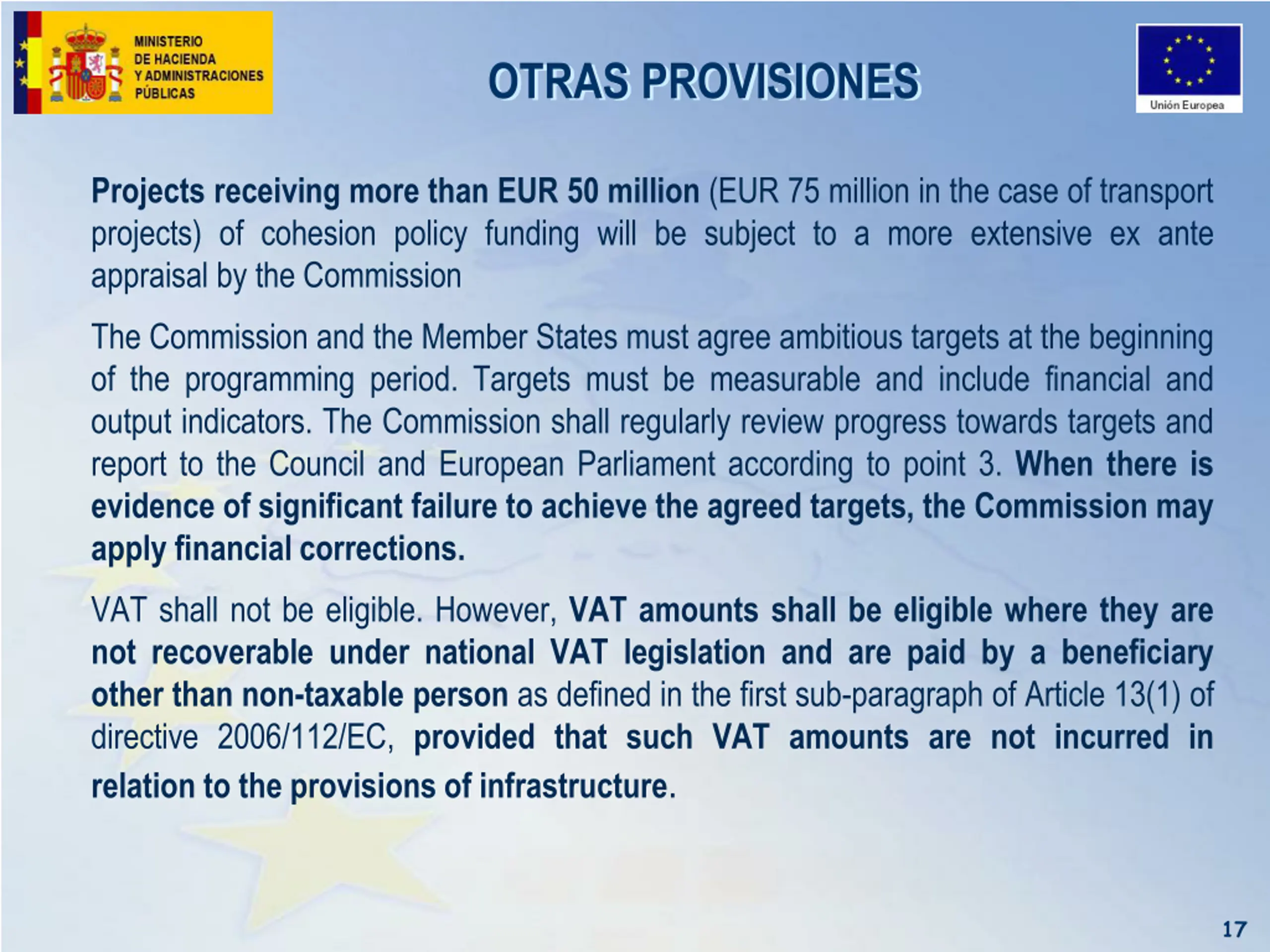 OTRAS PROVISIONES Projects receiving more than EUR 50 million (EUR 75 million in the case of transport projects) of cohesion policy funding will be subject to a more extensive ex ante appraisal by the Commission The Commission and the Member States must agree ambitious targets at the beginning of the programming period. Targets must be measurable and include financial and output indicators. The Commission shall regularly review progress towards targets and report to the Council and European Parliament according to point 3. When there is evidence of significant failure to achieve the agreed targets, the Commission may apply financial corrections. VAT shall not be eligible. However, VAT amounts shall be eligible where they are not recoverable under national VAT legislation and are paid by a beneficiary other than non-taxable person as defined in the first sub-paragraph of Article 13(1) of directive 2006/112/EC, provided that such VAT amounts are not incurred in relation to the provisions of infrastructure. 17