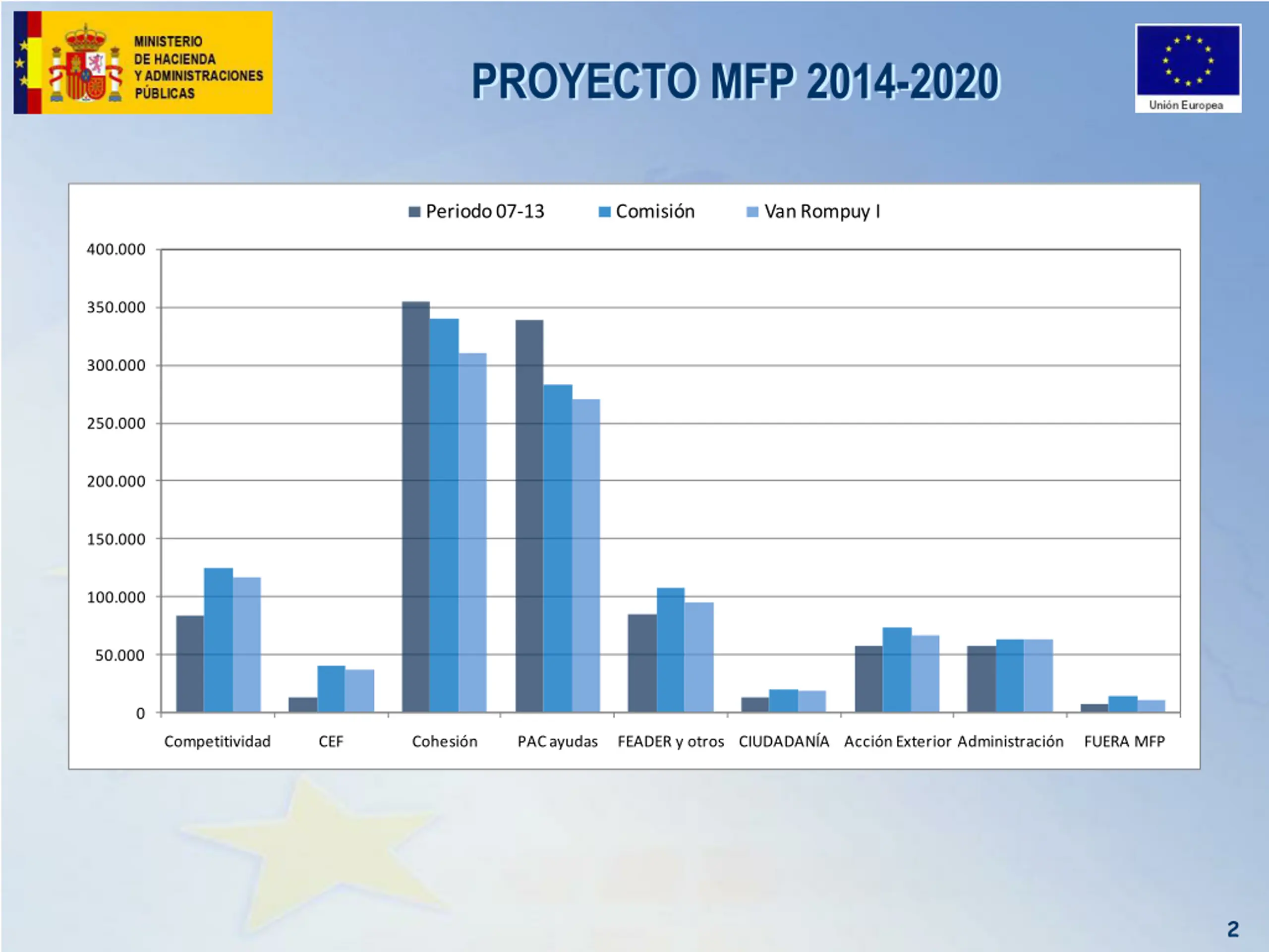 PROYECTO MFP 2014-2020 Periodo 07-13 Comisi n Van Rompuy I 400.000 350.000 300.000 250.000 200.000 150.000 100.000 50.000 0 Competitividad CEF Cohesi n PAC ayudas FEADER y otros CIUDADAN A Acci n Exterior Administraci n FUERA MFP 2