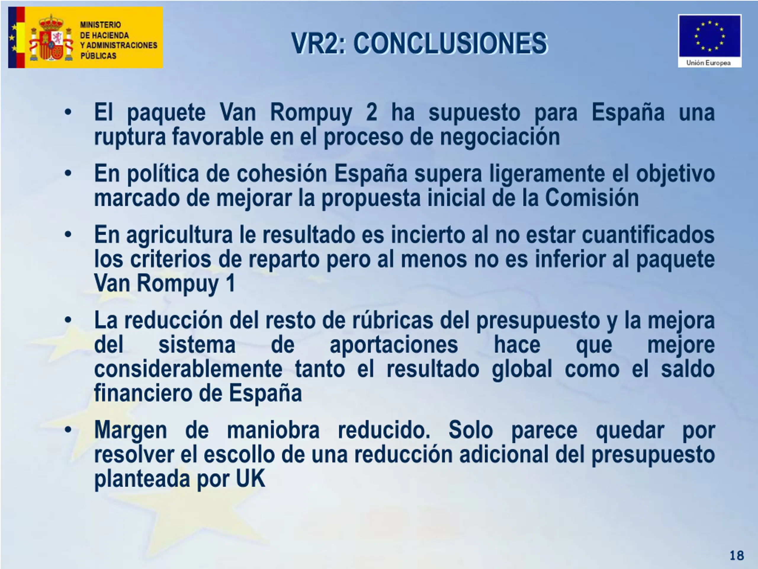 VR2: CONCLUSIONES El paquete Van Rompuy 2 ha supuesto para Espa a una ruptura favorable en el proceso de negociaci n En pol tica de cohesi n Espa a supera ligeramente el objetivo marcado de mejorar la propuesta inicial de la Comisi n En agricultura le resultado es incierto al no estar cuantificados los criterios de reparto pero al menos no es inferior al paquete Van Rompuy 1 La reducci n del resto de r bricas del presupuesto y la mejora del sistema de aportaciones considerablemente tanto el resultado global como el saldo financiero de Espa a Margen de maniobra reducido. Solo parece quedar por resolver el escollo de una reducci n adicional del presupuesto planteada por UK hace que mejore 18