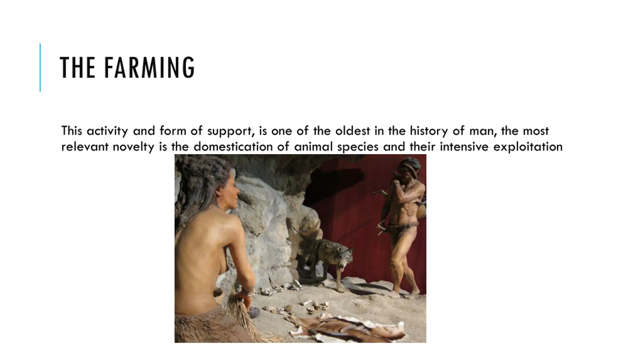 THE FARMING This activity and form of support, is one of the oldest in the history of man, the most relevant novelty is the domestication of animal species and their intensive exploitation