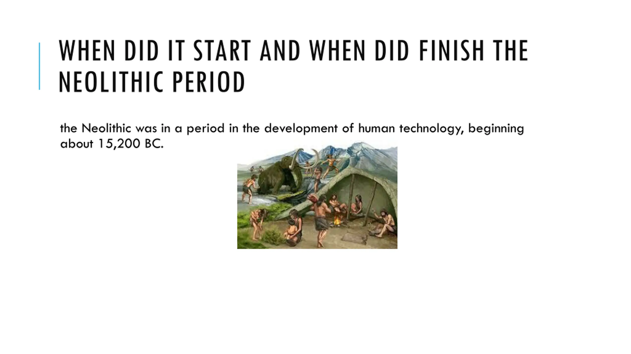 WHEN DID IT START AND WHEN DID FINISH THE NEOLITHIC PERIOD the Neolithic was in a period in the development of human technology, beginning about 15,200 BC.