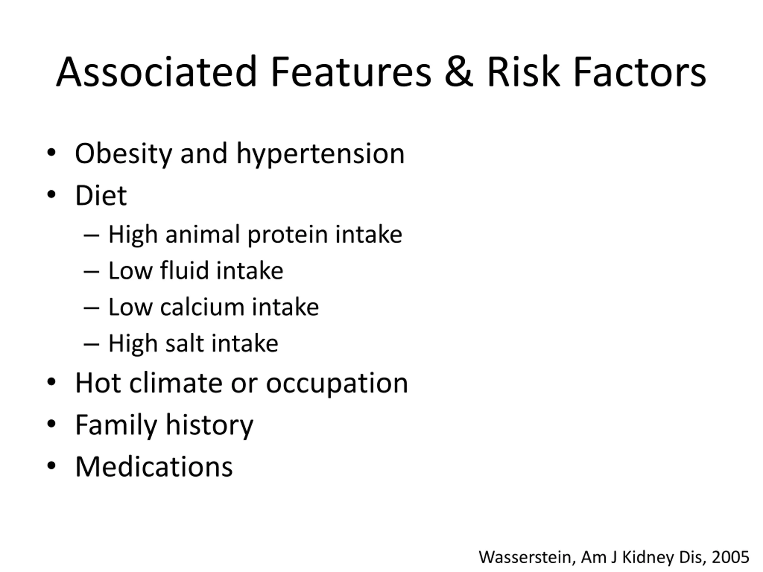 Associated Features & Risk Factors Obesity and hypertension Diet High animal protein intake Low fluid intake Low calcium intake High salt intake Hot climate or occupation Family history Medications Wasserstein, Am J Kidney Dis, 2005