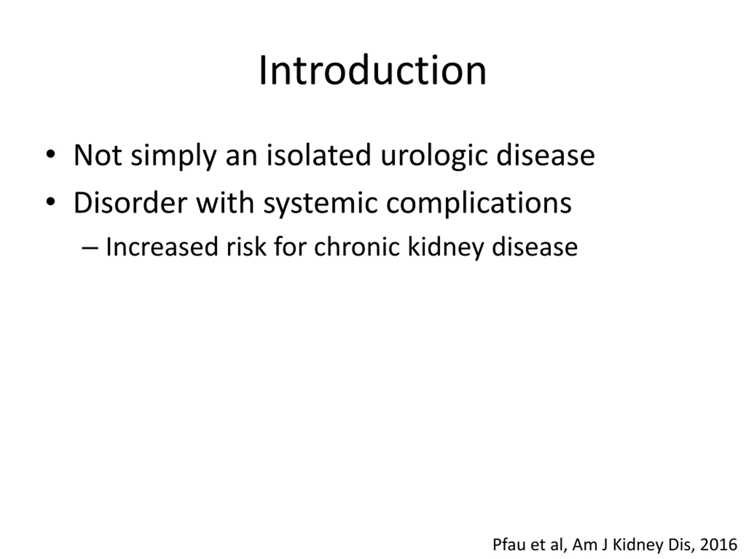 Introduction Not simply an isolated urologic disease Disorder with systemic complications Increased risk for chronic kidney disease Pfau et al, Am J Kidney Dis, 2016