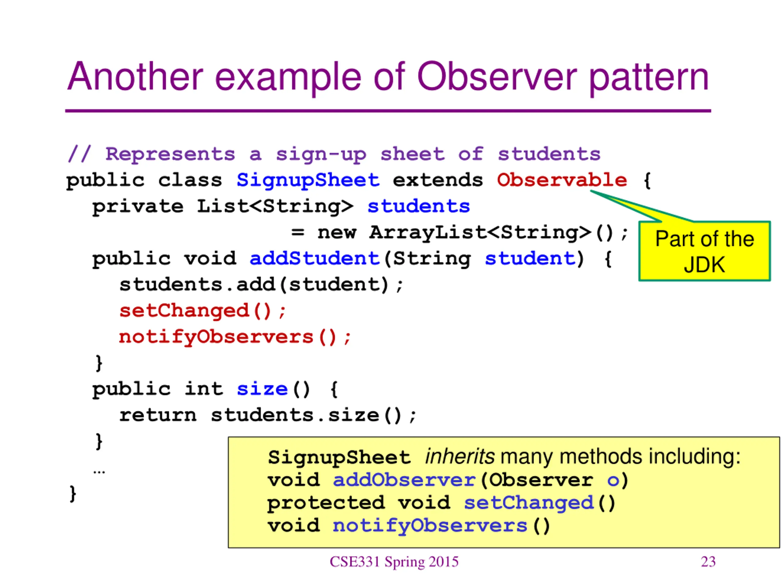 Another example of Observer pattern // Represents a sign-up sheet of students public class SignupSheet extends Observable { private List<String> students = new ArrayList<String>(); public void addStudent(String student) { students.add(student); setChanged(); notifyObservers(); } public int size() { return students.size(); } } protected void setChanged() void notifyObservers() Part of the JDK SignupSheet inherits many methods including: void addObserver(Observer o) CSE331 Spring 2015 23