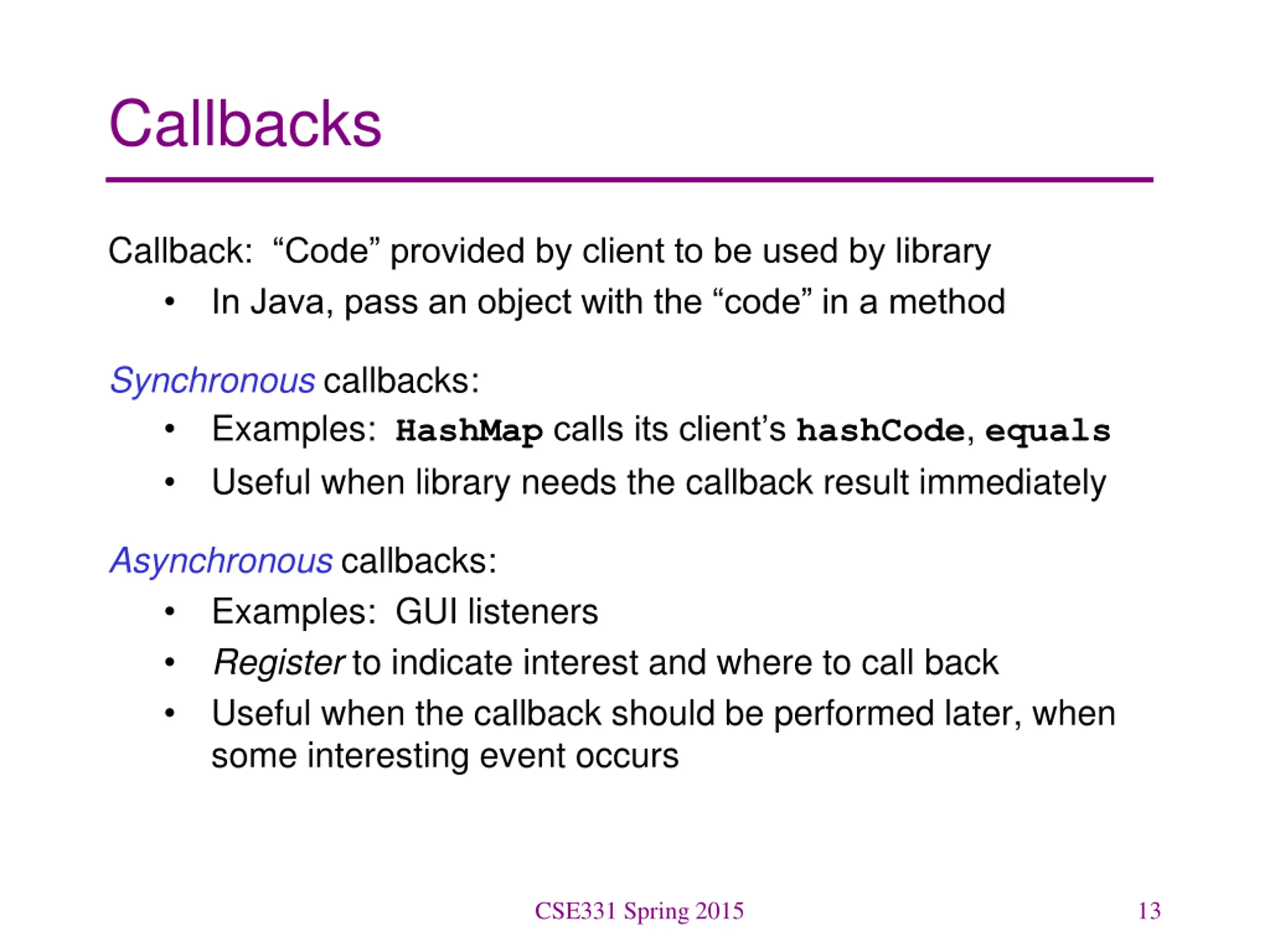 Callbacks Callback: Code provided by client to be used by library In Java, pass an object with the code in a method Synchronous callbacks: Examples: HashMapcalls its client s hashCode, equals Useful when library needs the callback result immediately Asynchronous callbacks: Examples: GUI listeners Register to indicate interest and where to call back Useful when the callback should be performed later, when some interesting event occurs CSE331 Spring 2015 13
