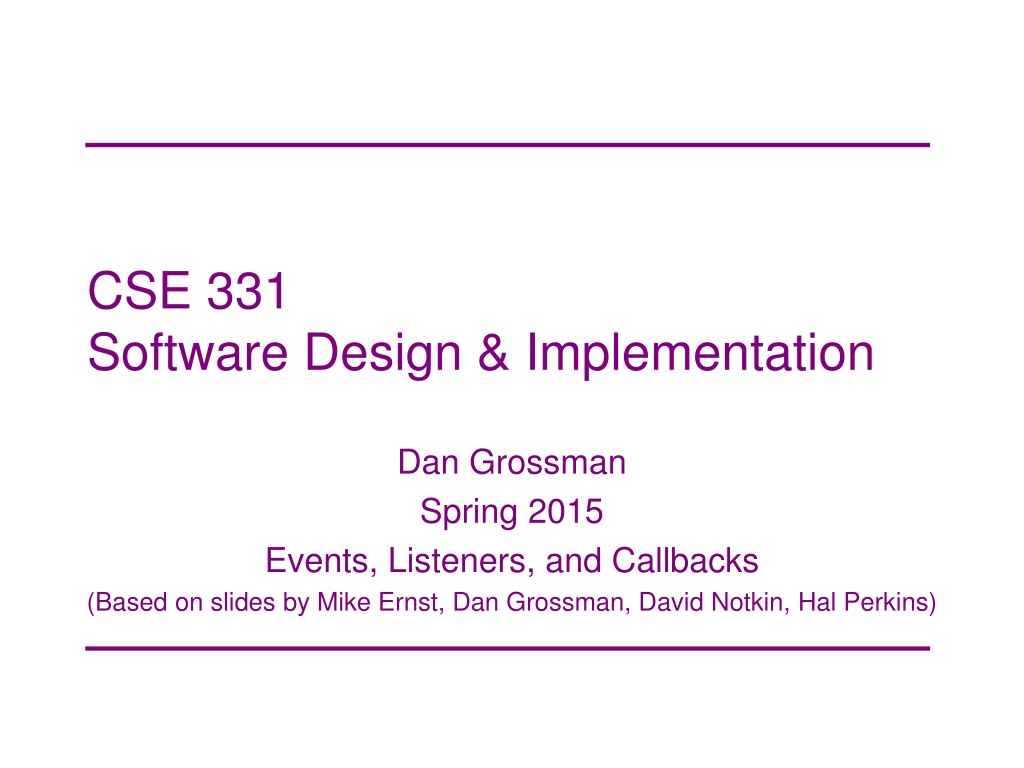 CSE 331 Software Design & Implementation Dan Grossman Spring 2015 Events, Listeners, and Callbacks (Based on slides by Mike Ernst, Dan Grossman, David Notkin, Hal Perkins)