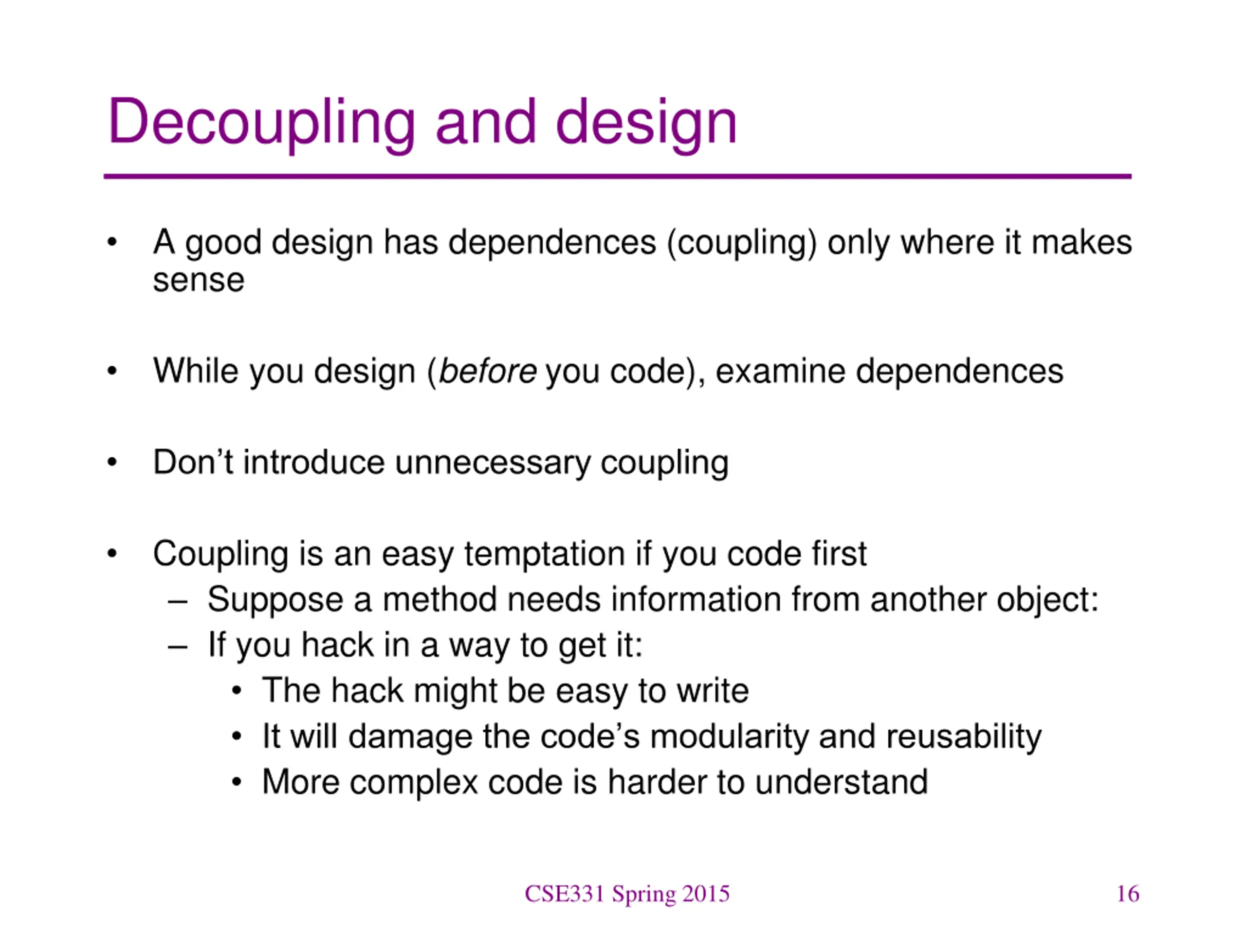 Decoupling and design A good design has dependences (coupling) only where it makes sense While you design (before you code), examine dependences Don t introduce unnecessary coupling Coupling is an easy temptation if you code first Suppose a method needs information from another object: If you hack in a way to get it: The hack might be easy to write It will damage the code s modularity and reusability More complex code is harder to understand CSE331 Spring 2015 16