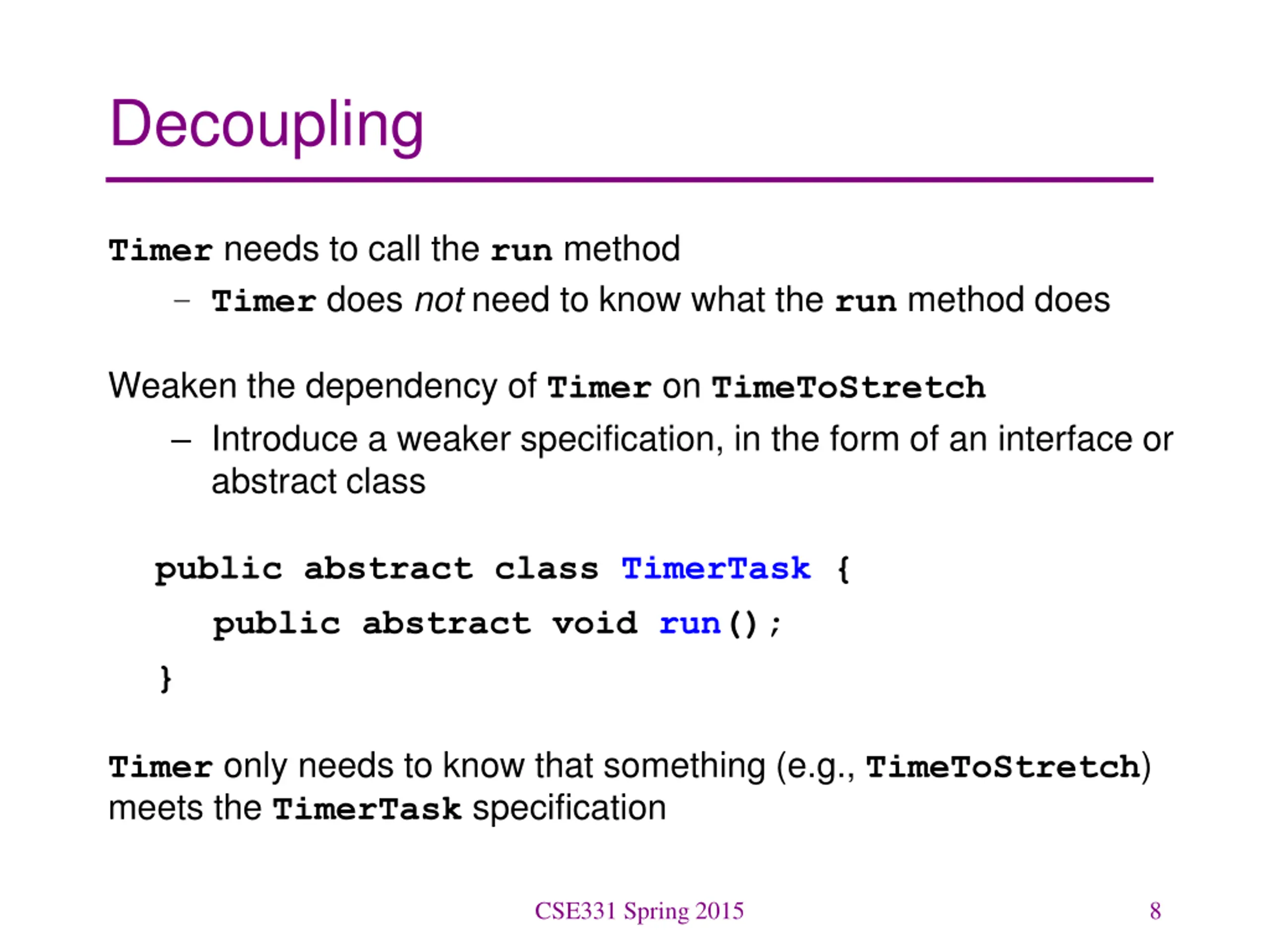 Decoupling Timer needs to call the run method Timer does not need to know what the run method does Weaken the dependency of Timer on TimeToStretch Introduce a weaker specification, in the form of an interface or abstract class public abstract class TimerTask { public abstract void run(); } Timer only needs to know that something (e.g., TimeToStretch) meets the TimerTask specification CSE331 Spring 2015 8