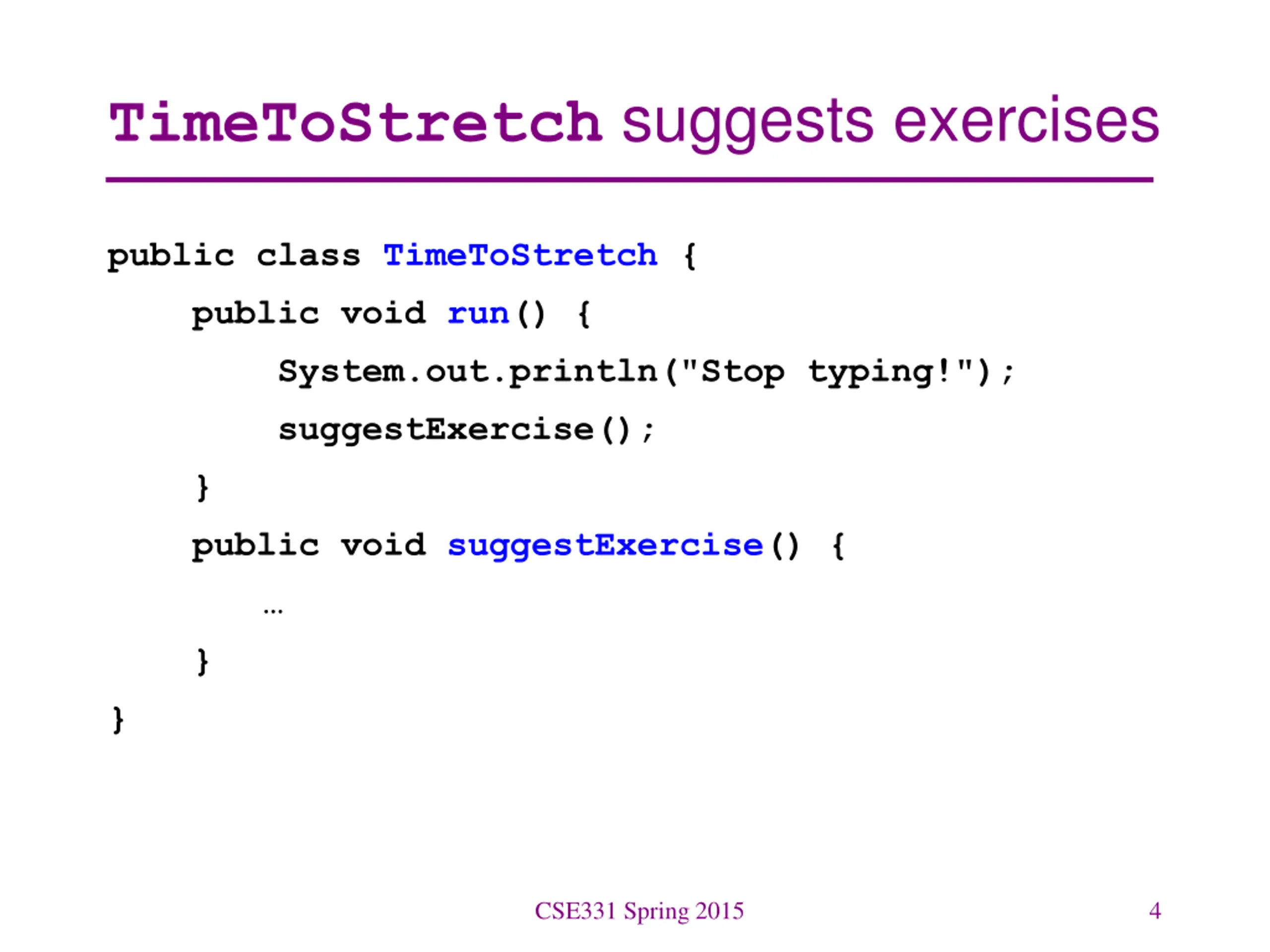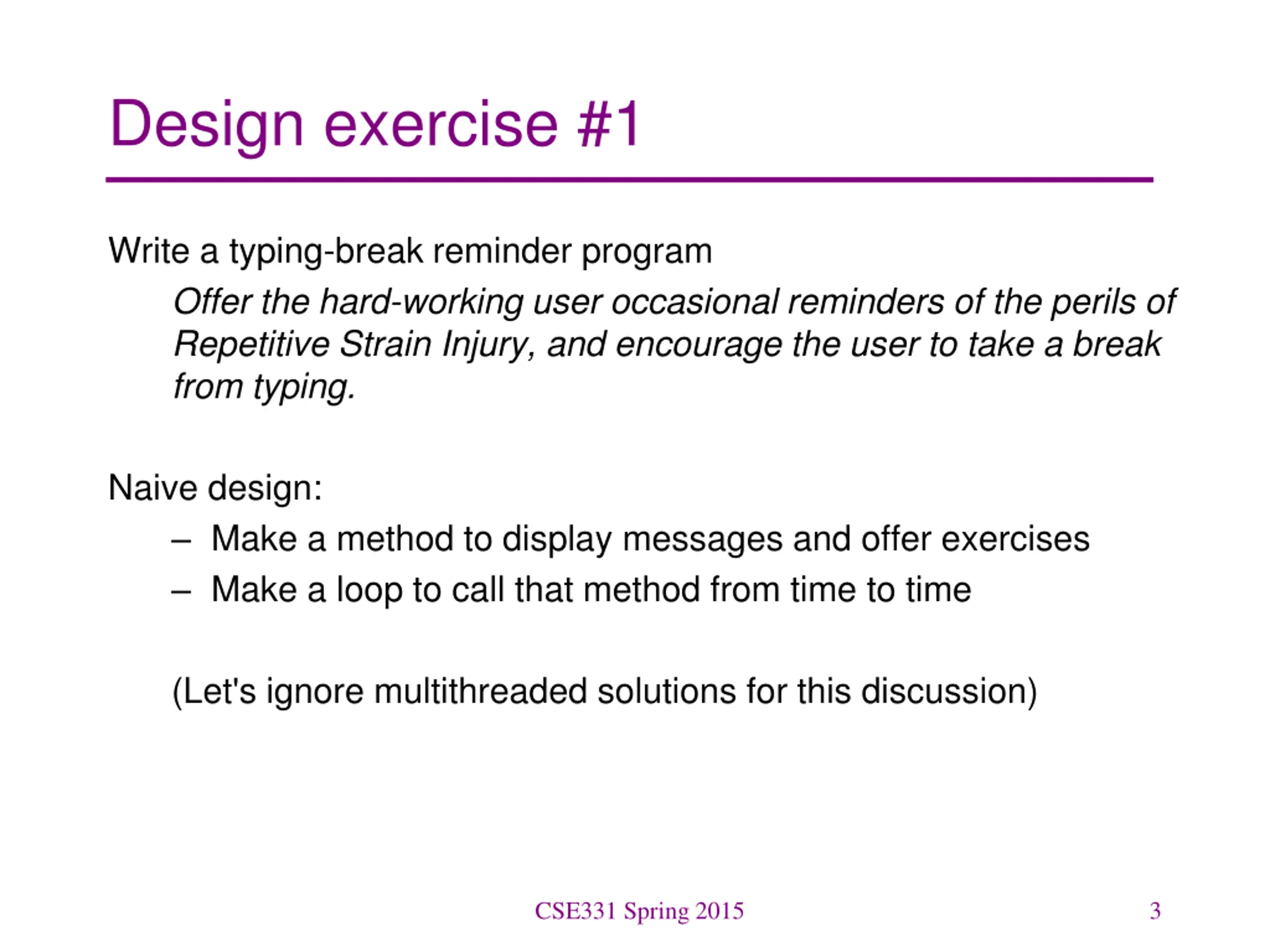 Design exercise #1 Write a typing-break reminder program Offer the hard-working user occasional reminders of the perils of Repetitive Strain Injury, and encourage the user to take a break from typing. Naive design: Make a method to display messages and offer exercises Make a loop to call that method from time to time (Let's ignore multithreaded solutions for this discussion) CSE331 Spring 2015 3