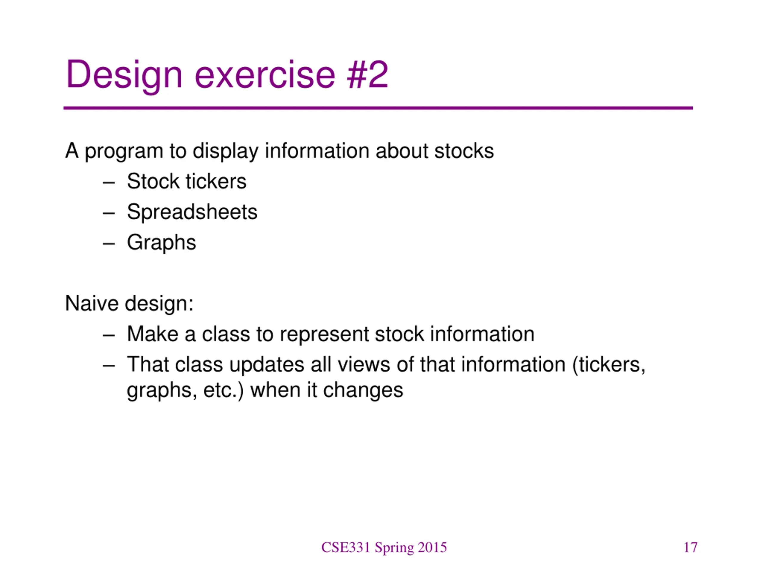 Design exercise #2 A program to display information about stocks Stock tickers Spreadsheets Graphs Naive design: Make a class to represent stock information That class updates all views of that information (tickers, graphs, etc.) when it changes CSE331 Spring 2015 17