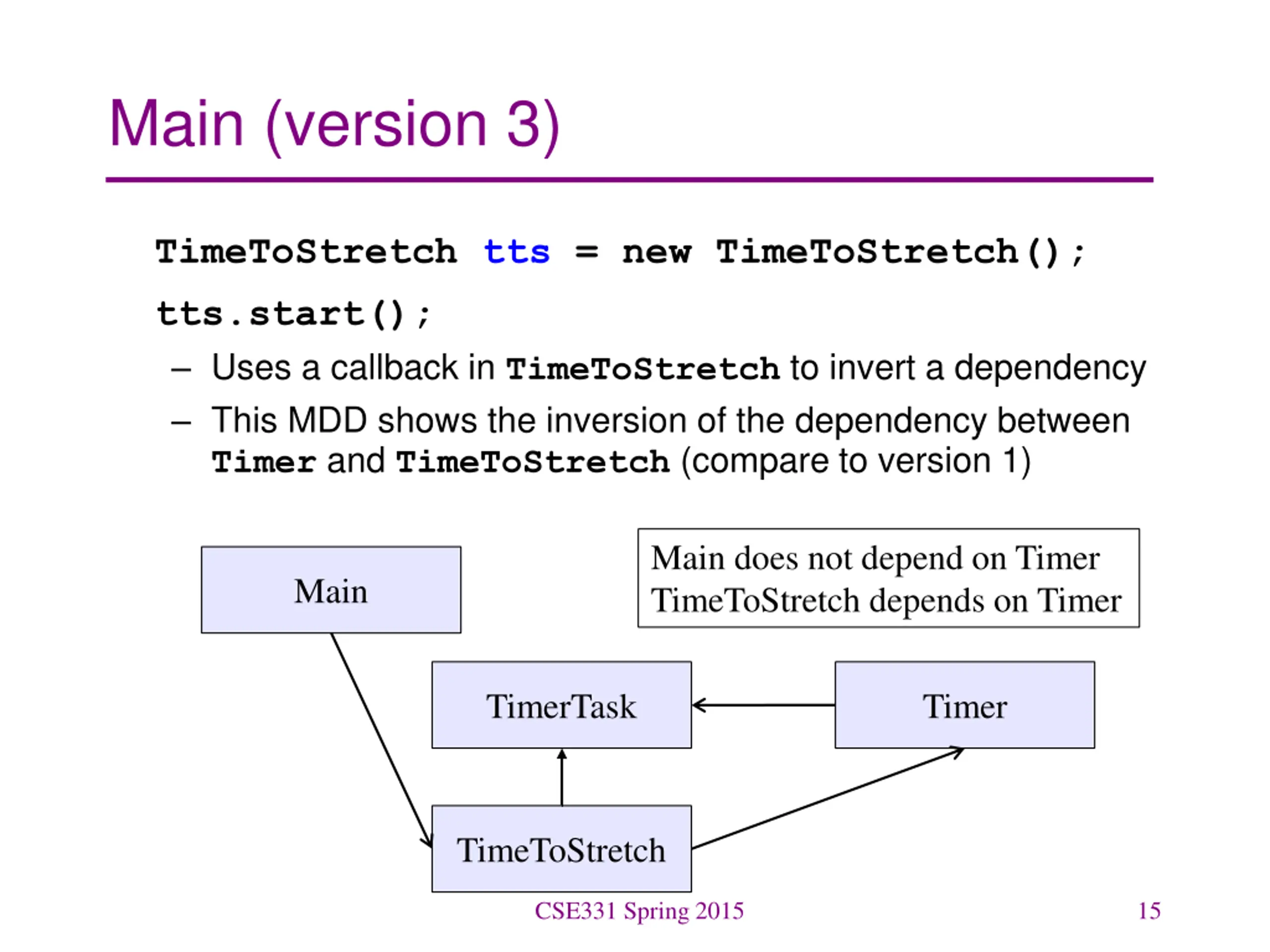 Main (version 3) TimeToStretch tts = new TimeToStretch(); tts.start(); Uses a callback in TimeToStretchto invert a dependency This MDD shows the inversion of the dependency between Timer and TimeToStretch (compare to version 1) Main does not depend on Timer TimeToStretch depends on Timer Main TimerTask Timer TimeToStretch CSE331 Spring 2015 15