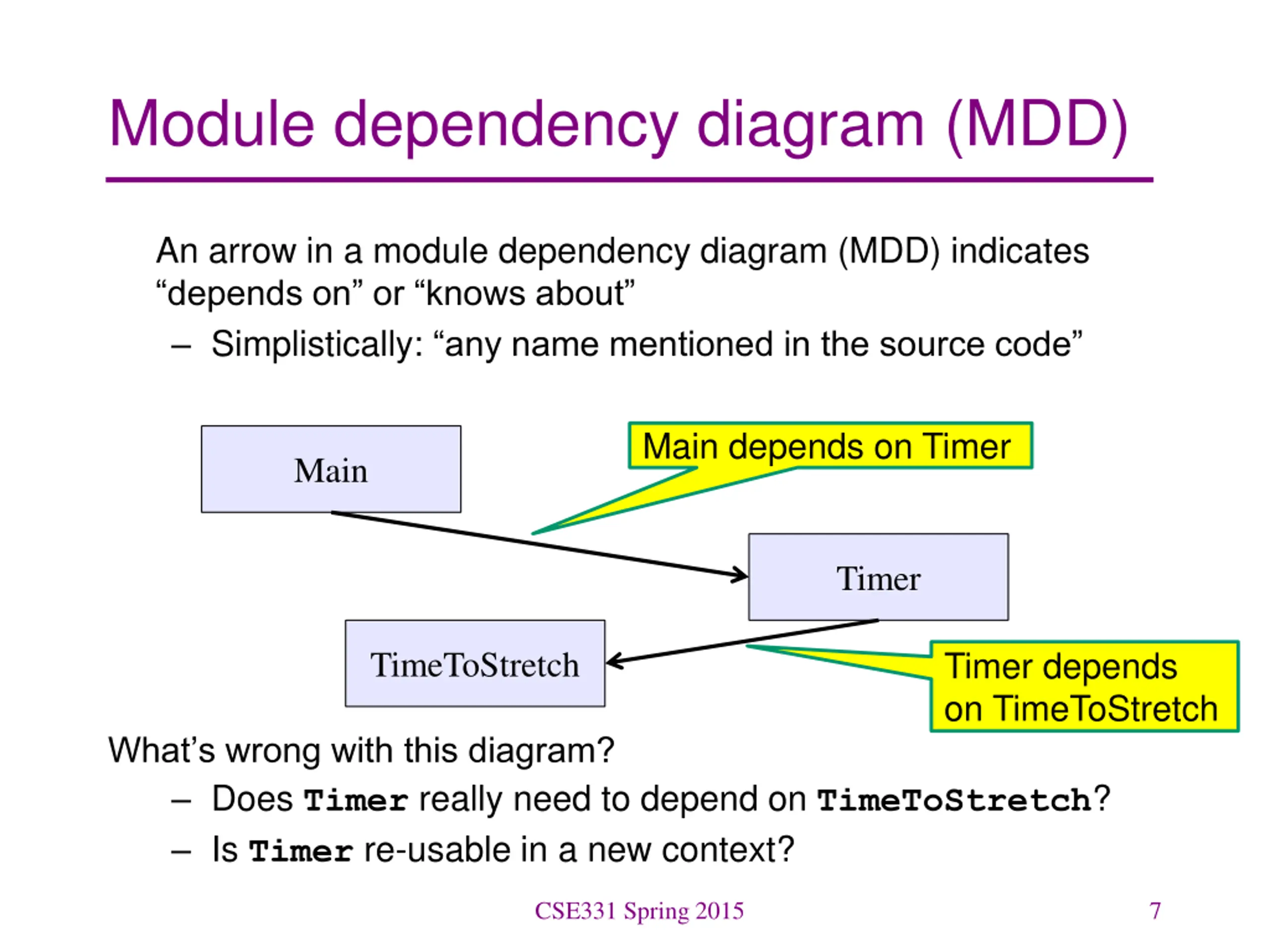 Module dependency diagram (MDD) An arrow in a module dependency diagram (MDD) indicates depends on or knows about Simplistically: any name mentioned in the source code Main depends on Timer Main Timer TimeToStretch Timer depends on TimeToStretch What s wrong with this diagram? Does Timer really need to depend on TimeToStretch? Is Timer re-usable in a new context? CSE331 Spring 2015 7
