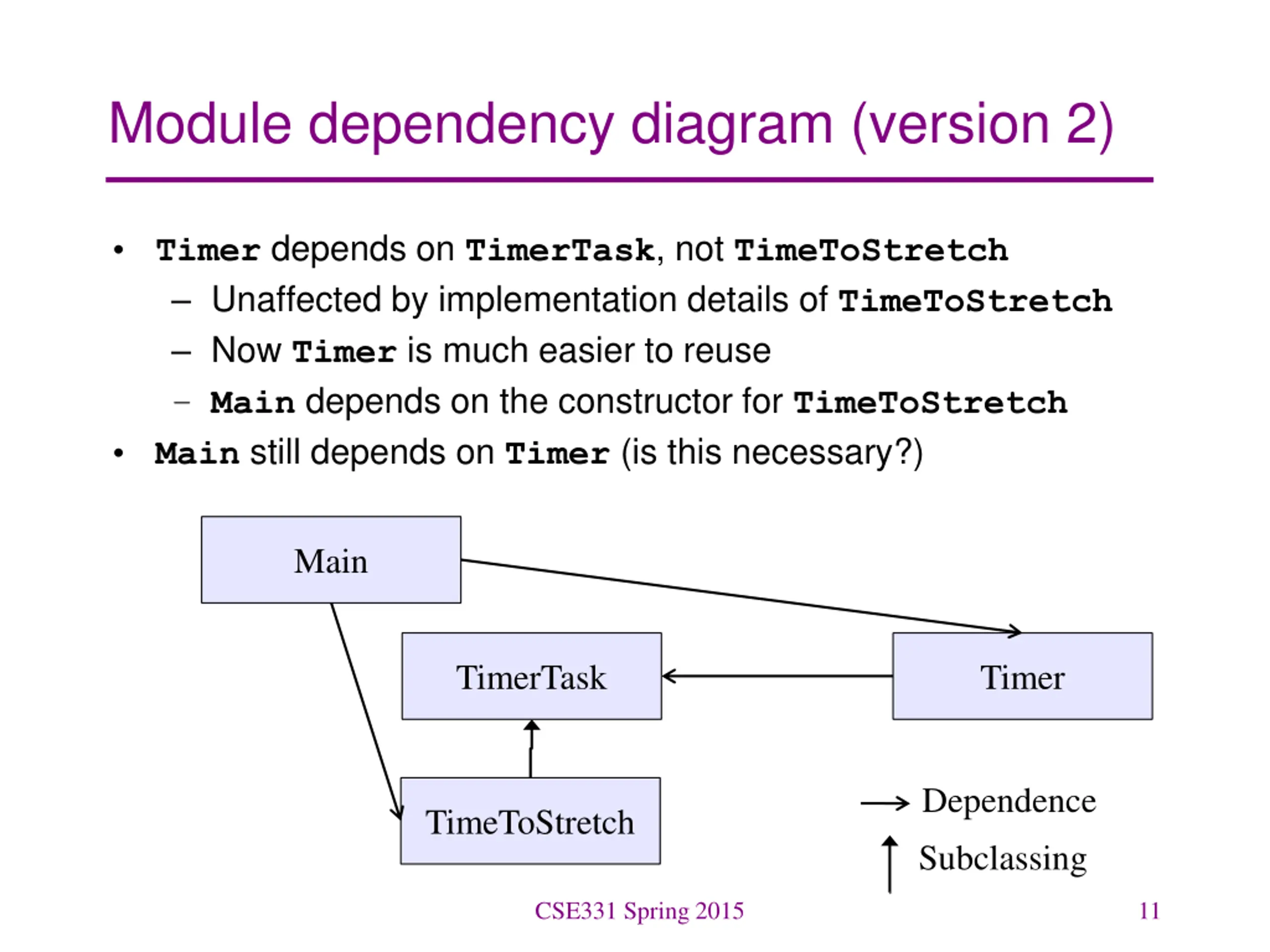 Module dependency diagram (version 2) Timer depends on TimerTask, not TimeToStretch Unaffected by implementation details of TimeToStretch Now Timer is much easier to reuse Main depends on the constructor for TimeToStretch Main still depends on Timer (is this necessary?) Main TimerTask Timer Dependence TimeToStretch Subclassing CSE331 Spring 2015 11