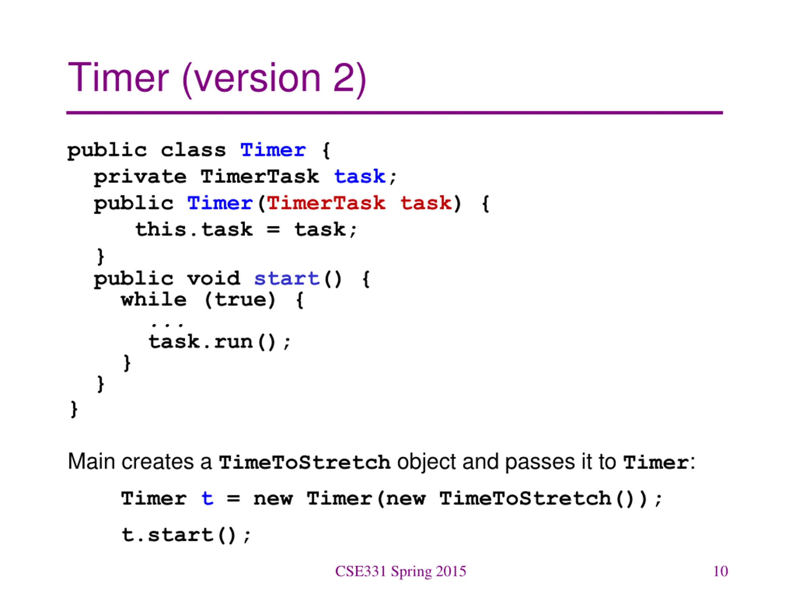 Timer (version 2) public class Timer { private TimerTask task; public Timer(TimerTask task) { this.task = task; } public void start() { while (true) { ... task.run(); } } } Main creates a TimeToStretch object and passes it to Timer: Timer t = new Timer(new TimeToStretch()); t.start(); CSE331 Spring 2015 10