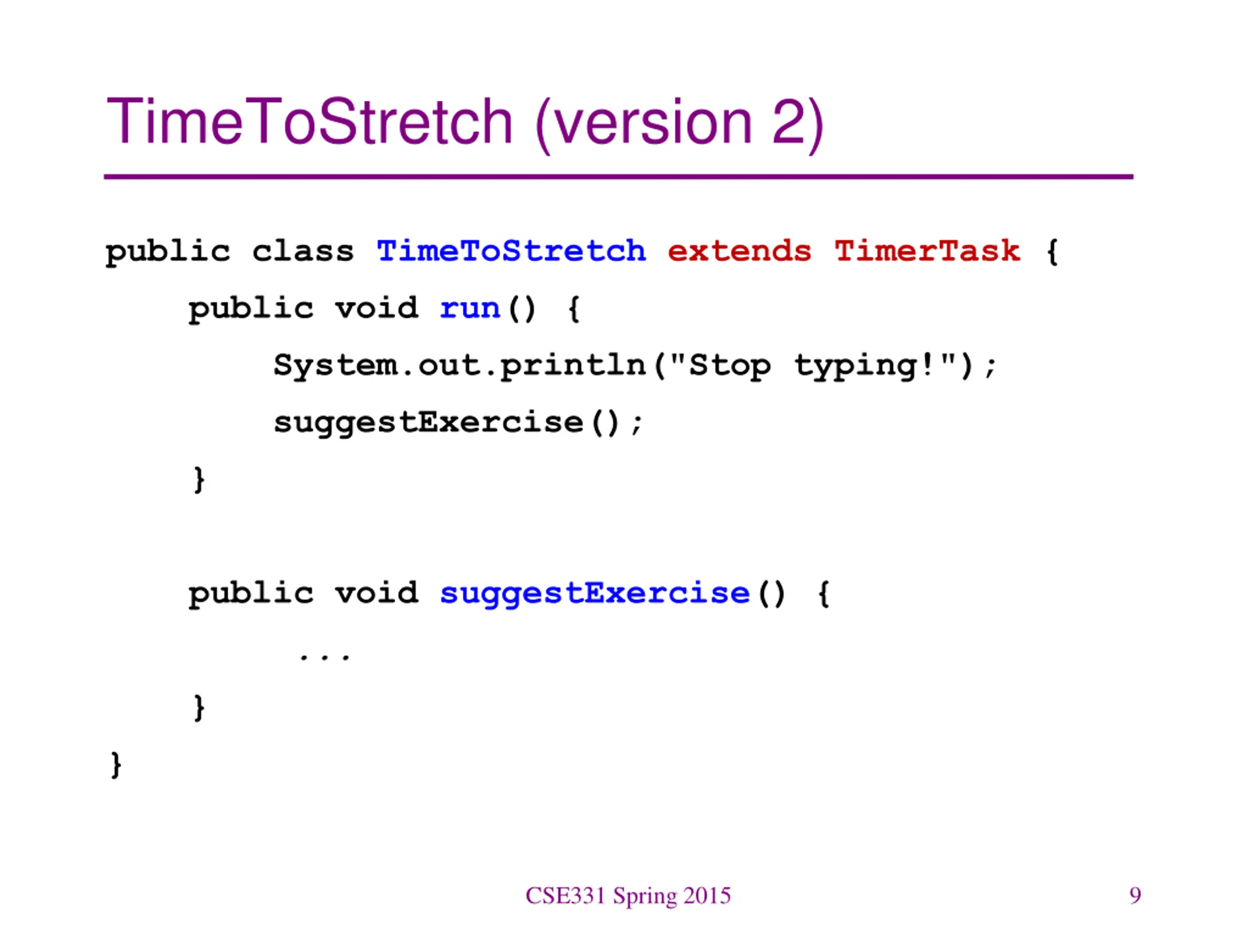 TimeToStretch (version 2) public class TimeToStretch extends TimerTask { public void run() { System.out.println("Stop typing!"); suggestExercise(); } public void suggestExercise() { ... } } CSE331 Spring 2015 9