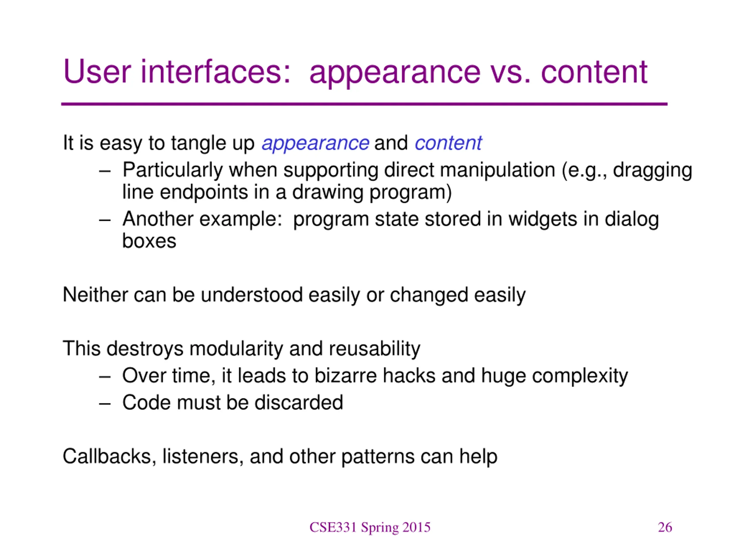 User interfaces: appearance vs. content It is easy to tangle up appearance and content Particularly when supporting direct manipulation (e.g., dragging line endpoints in a drawing program) Another example: program state stored in widgets in dialog boxes Neither can be understood easily or changed easily This destroys modularity and reusability Over time, it leads to bizarre hacks and huge complexity Code must be discarded Callbacks, listeners, and other patterns can help CSE331 Spring 2015 26