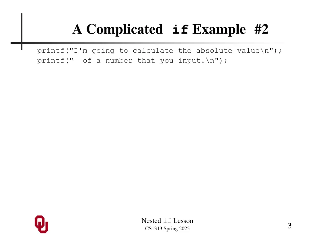 A Complicated if Example#2 printf("I'm going to calculate the absolute value\n"); printf(" of a number that you input.\n"); Nested if Lesson CS1313 Spring 2025 3