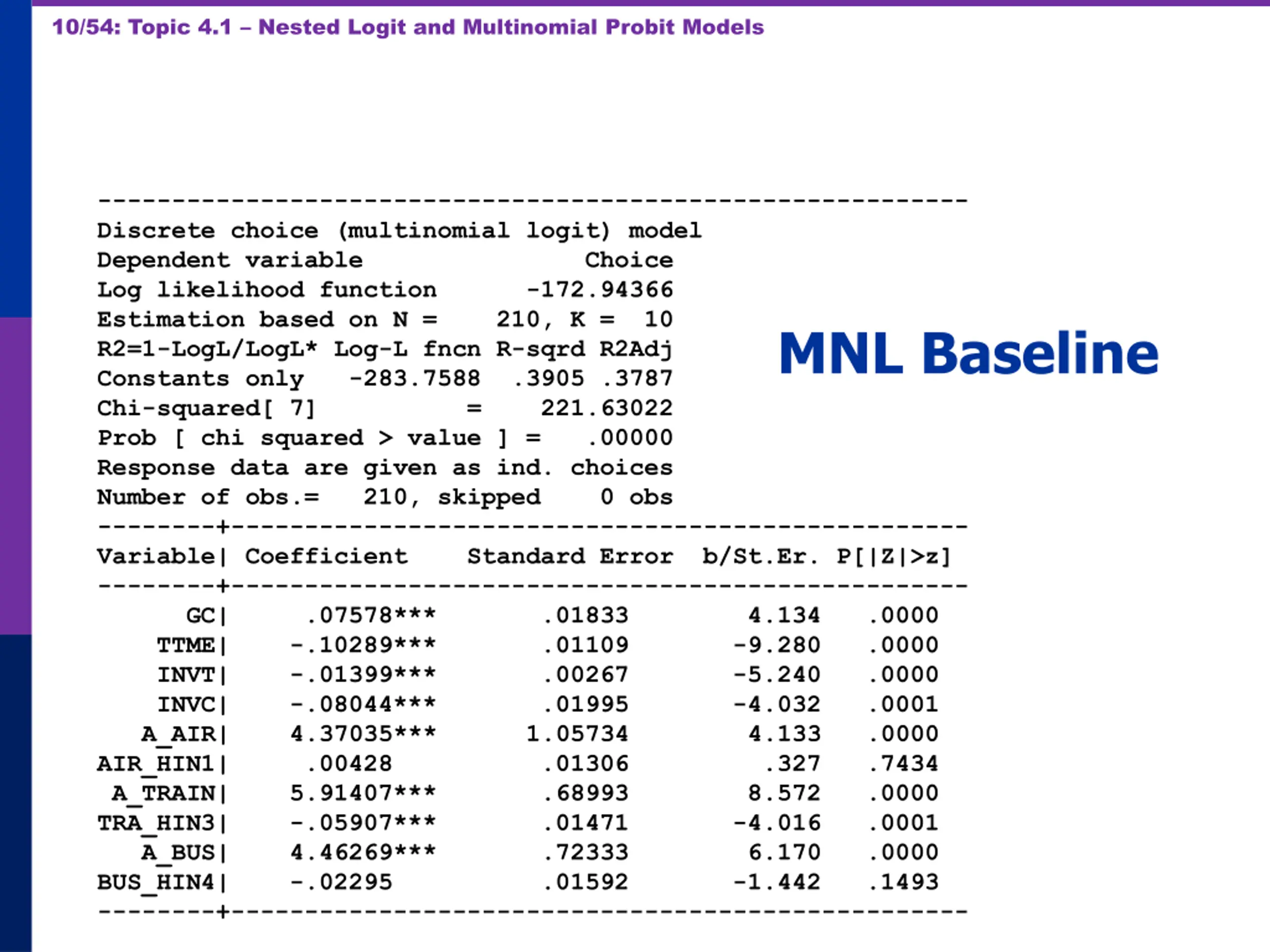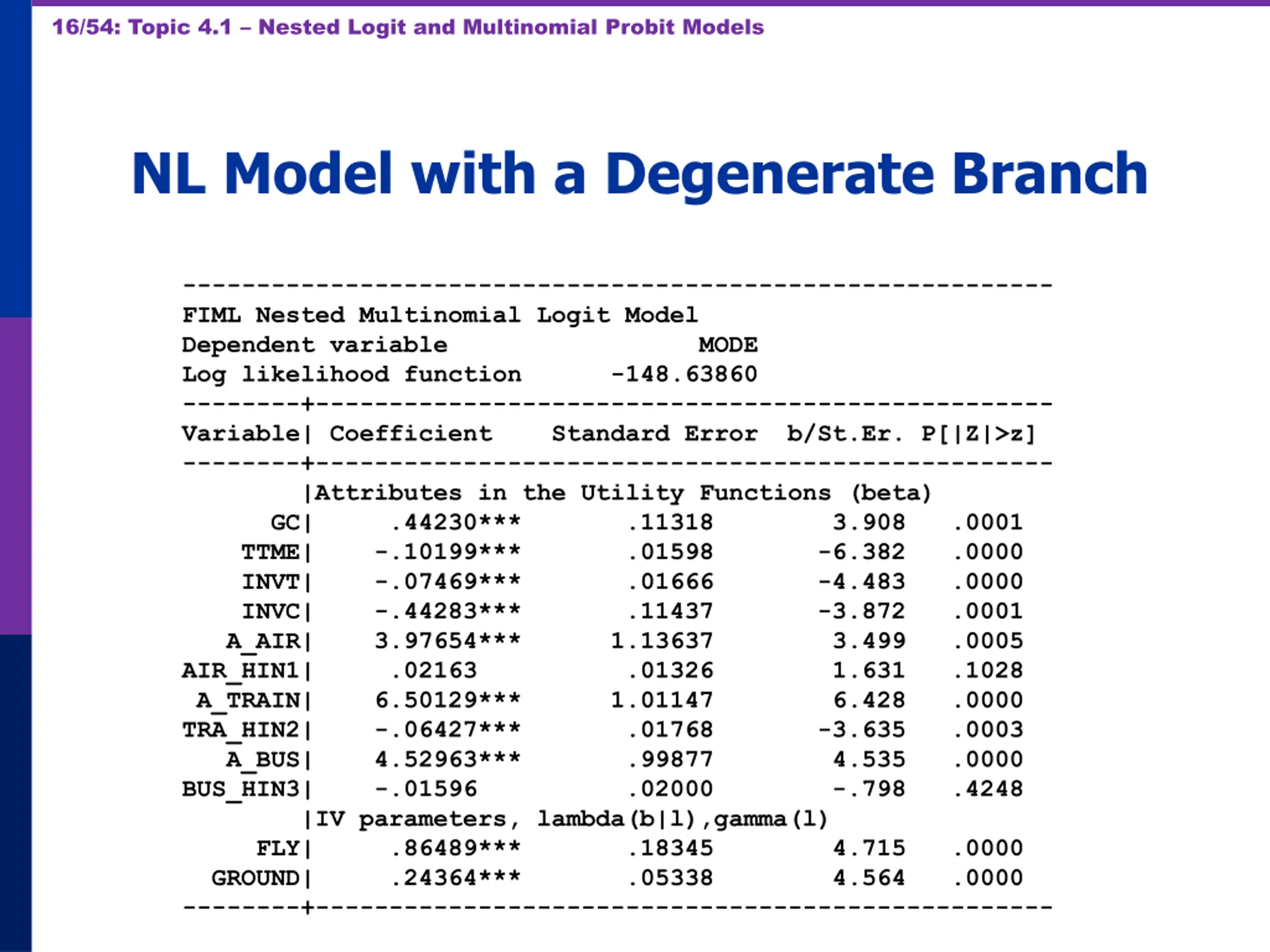 16/54: Topic 4.1 Nested Logit and Multinomial Probit Models NL Model with a Degenerate Branch ----------------------------------------------------------- FIML Nested Multinomial Logit Model Dependent variable MODE Log likelihood function -148.63860 --------+-------------------------------------------------- Variable| Coefficient Standard Error b/St.Er. P[|Z|>z] --------+-------------------------------------------------- |Attributes in the Utility Functions (beta) GC| .44230*** .11318 3.908 .0001 TTME| -.10199*** .01598 -6.382 .0000 INVT| -.07469*** .01666 -4.483 .0000 INVC| -.44283*** .11437 -3.872 .0001 A_AIR| 3.97654*** 1.13637 3.499 .0005 AIR_HIN1| .02163 .01326 1.631 .1028 A_TRAIN| 6.50129*** 1.01147 6.428 .0000 TRA_HIN2| -.06427*** .01768 -3.635 .0003 A_BUS| 4.52963*** .99877 4.535 .0000 BUS_HIN3| -.01596 .02000 -.798 .4248 |IV parameters, lambda(b|l),gamma(l) FLY| .86489*** .18345 4.715 .0000 GROUND| .24364*** .05338 4.564 .0000 --------+--------------------------------------------------