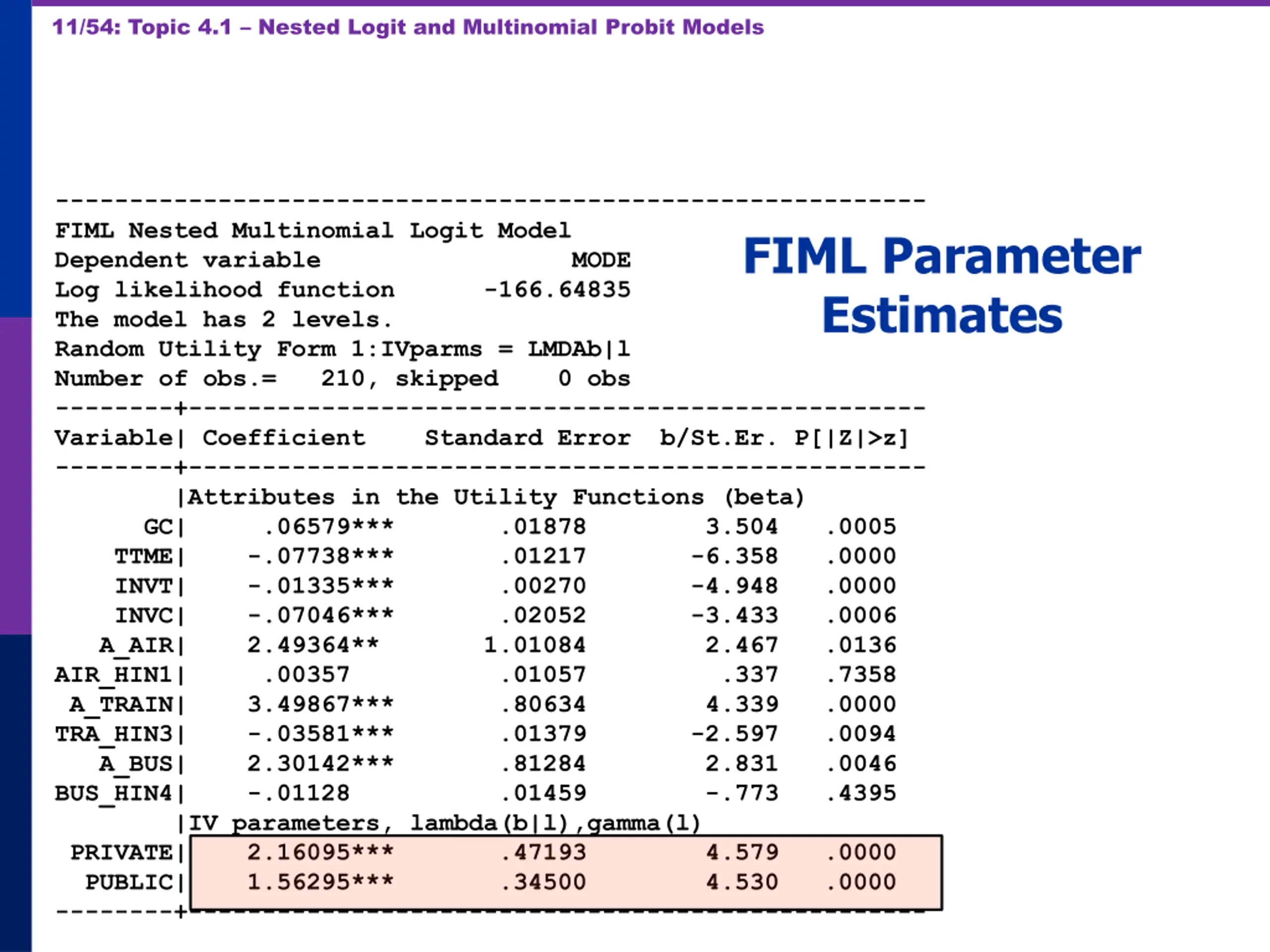 11/54: Topic 4.1 Nested Logit and Multinomial Probit Models ----------------------------------------------------------- FIML Nested Multinomial Logit Model Dependent variable MODE Log likelihood function -166.64835 The model has 2 levels. Random Utility Form 1:IVparms = LMDAb|l Number of obs.= 210, skipped 0 obs --------+-------------------------------------------------- Variable| Coefficient Standard Error b/St.Er. P[|Z|>z] --------+-------------------------------------------------- |Attributes in the Utility Functions (beta) GC| .06579*** .01878 3.504 .0005 TTME| -.07738*** .01217 -6.358 .0000 INVT| -.01335*** .00270 -4.948 .0000 INVC| -.07046*** .02052 -3.433 .0006 A_AIR| 2.49364** 1.01084 2.467 .0136 AIR_HIN1| .00357 .01057 .337 .7358 A_TRAIN| 3.49867*** .80634 4.339 .0000 TRA_HIN3| -.03581*** .01379 -2.597 .0094 A_BUS| 2.30142*** .81284 2.831 .0046 BUS_HIN4| -.01128 .01459 -.773 .4395 |IV parameters, lambda(b|l),gamma(l) PRIVATE| 2.16095*** .47193 4.579 .0000 PUBLIC| 1.56295*** .34500 4.530 .0000 --------+-------------------------------------------------- FIML Parameter Estimates
