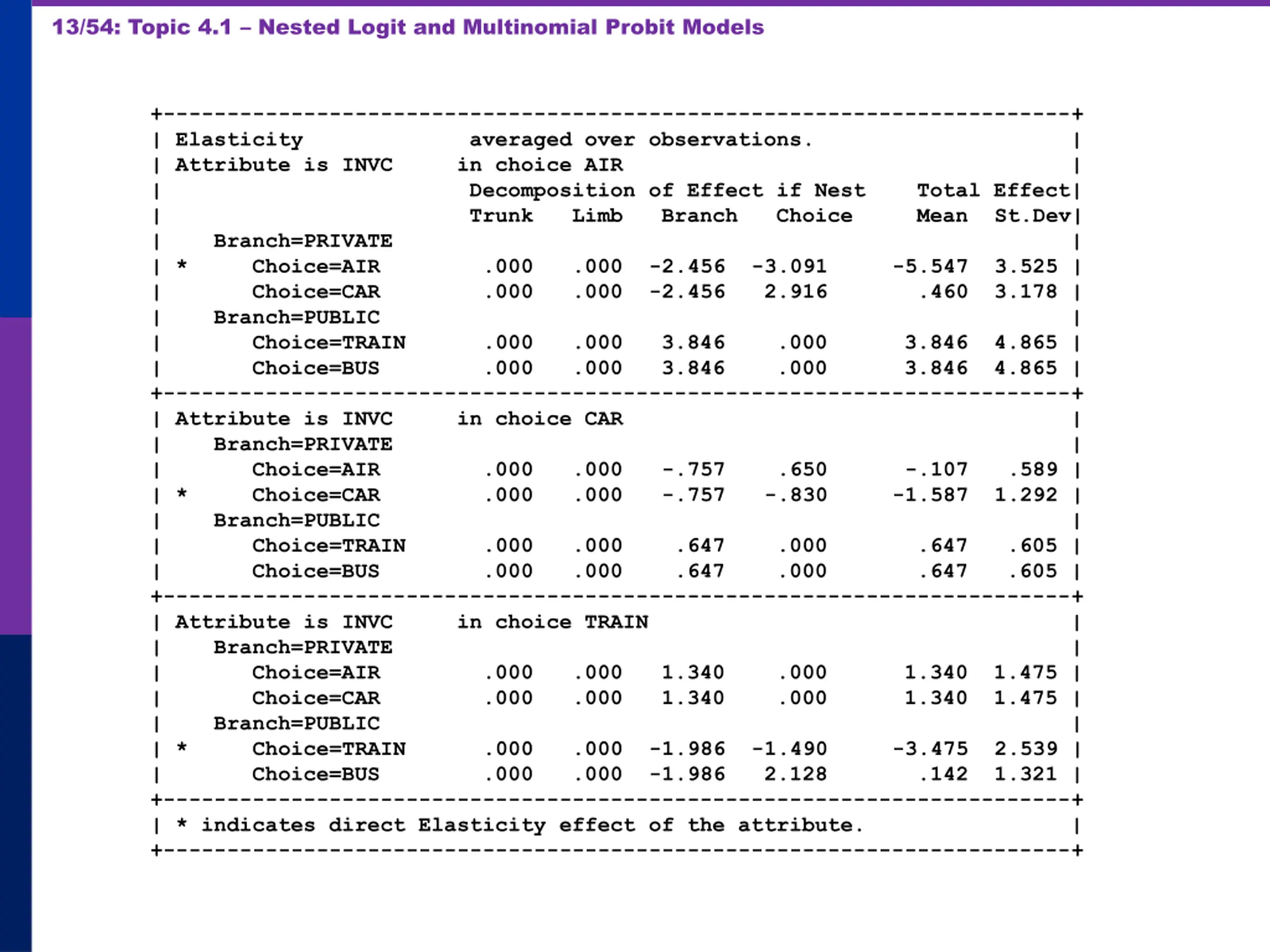 13/54: Topic 4.1 Nested Logit and Multinomial Probit Models +-----------------------------------------------------------------------+ | Elasticity averaged over observations. | | Attribute is INVC in choice AIR | | Decomposition of Effect if Nest Total Effect| | Trunk Limb Branch Choice Mean St.Dev| | Branch=PRIVATE | | * Choice=AIR .000 .000 -2.456 -3.091 -5.547 3.525 | | Choice=CAR .000 .000 -2.456 2.916 .460 3.178 | | Branch=PUBLIC | | Choice=TRAIN .000 .000 3.846 .000 3.846 4.865 | | Choice=BUS .000 .000 3.846 .000 3.846 4.865 | +-----------------------------------------------------------------------+ | Attribute is INVC in choice CAR | | Branch=PRIVATE | | Choice=AIR .000 .000 -.757 .650 -.107 .589 | | * Choice=CAR .000 .000 -.757 -.830 -1.587 1.292 | | Branch=PUBLIC | | Choice=TRAIN .000 .000 .647 .000 .647 .605 | | Choice=BUS .000 .000 .647 .000 .647 .605 | +-----------------------------------------------------------------------+ | Attribute is INVC in choice TRAIN | | Branch=PRIVATE | | Choice=AIR .000 .000 1.340 .000 1.340 1.475 | | Choice=CAR .000 .000 1.340 .000 1.340 1.475 | | Branch=PUBLIC | | * Choice=TRAIN .000 .000 -1.986 -1.490 -3.475 2.539 | | Choice=BUS .000 .000 -1.986 2.128 .142 1.321 | +-----------------------------------------------------------------------+ | * indicates direct Elasticity effect of the attribute. | +-----------------------------------------------------------------------+