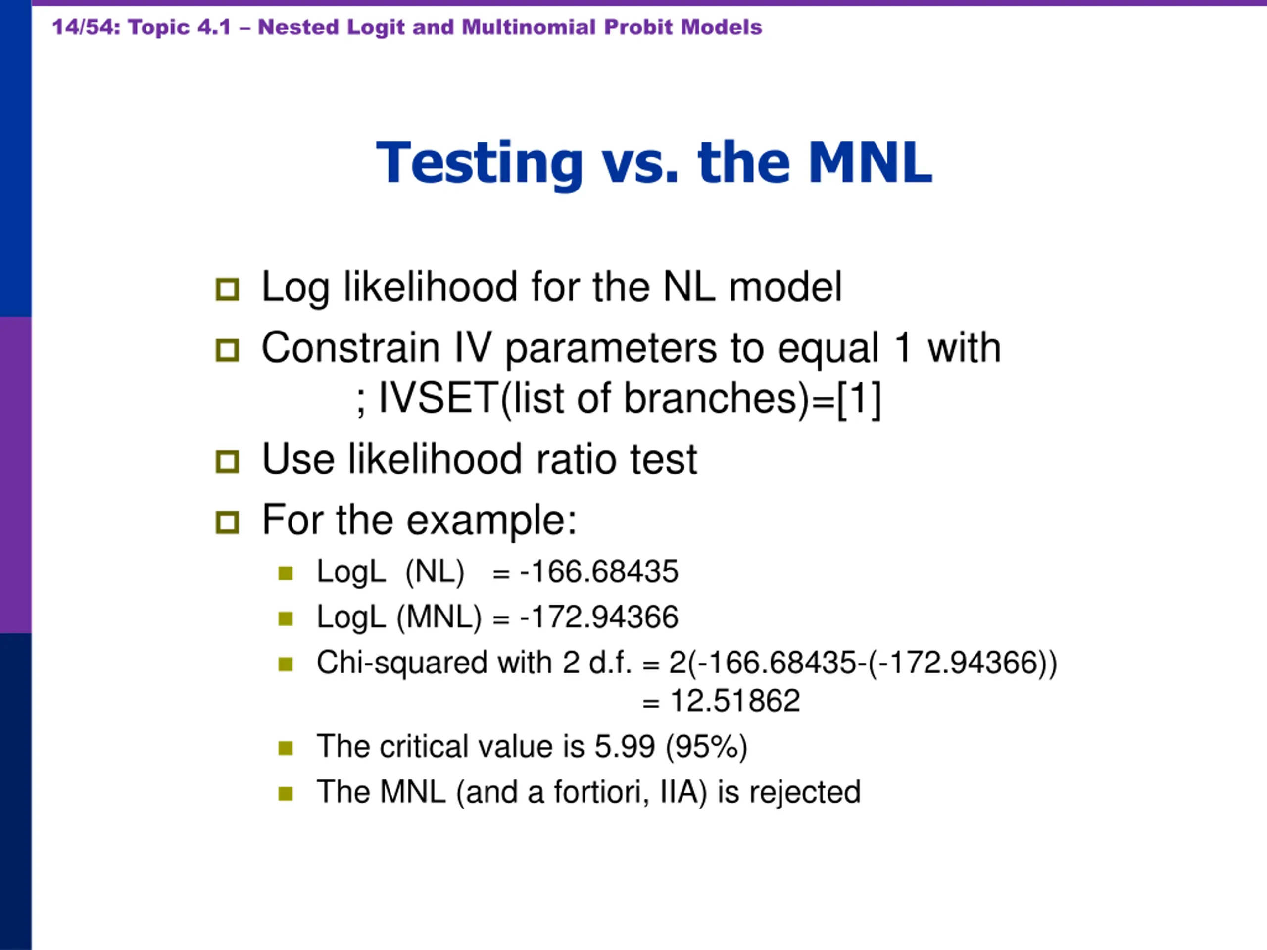 14/54: Topic 4.1 Nested Logit and Multinomial Probit Models Testing vs. the MNL Log likelihood for the NL model Constrain IV parameters to equal 1 with ; IVSET(list of branches)=[1] Use likelihood ratio test For the example: LogL (NL) = -166.68435 LogL (MNL) = -172.94366 Chi-squared with 2 d.f. = 2(-166.68435-(-172.94366)) = 12.51862 The critical value is 5.99 (95%) The MNL (and a fortiori, IIA) is rejected