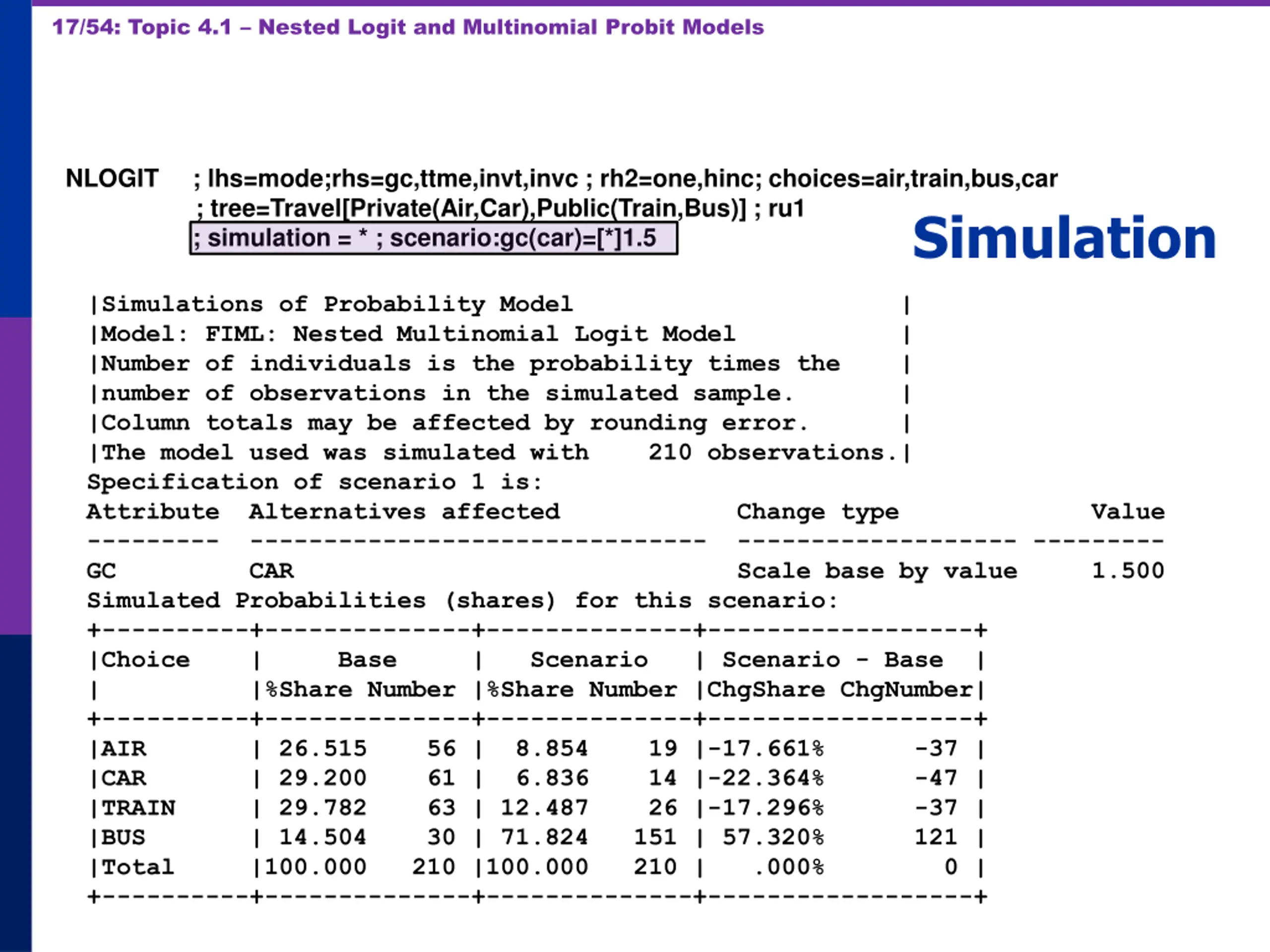 17/54: Topic 4.1 Nested Logit and Multinomial Probit Models NLOGIT ; lhs=mode;rhs=gc,ttme,invt,invc ; rh2=one,hinc; choices=air,train,bus,car ; tree=Travel[Private(Air,Car),Public(Train,Bus)] ; ru1 ; simulation = * ; scenario:gc(car)=[*]1.5 Simulation |Simulations of Probability Model | |Model: FIML: Nested Multinomial Logit Model | |Number of individuals is the probability times the | |number of observations in the simulated sample. | |Column totals may be affected by rounding error. | |The model used was simulated with 210 observations.| Specification of scenario 1 is: Attribute Alternatives affected Change type Value --------- ------------------------------- ------------------- --------- GC CAR Scale base by value 1.500 Simulated Probabilities (shares) for this scenario: +----------+--------------+--------------+------------------+ |Choice | Base | Scenario | Scenario - Base | | |%Share Number |%Share Number |ChgShare ChgNumber| +----------+--------------+--------------+------------------+ |AIR | 26.515 56 | 8.854 19 |-17.661% -37 | |CAR | 29.200 61 | 6.836 14 |-22.364% -47 | |TRAIN | 29.782 63 | 12.487 26 |-17.296% -37 | |BUS | 14.504 30 | 71.824 151 | 57.320% 121 | |Total |100.000 210 |100.000 210 | .000% 0 | +----------+--------------+--------------+------------------+