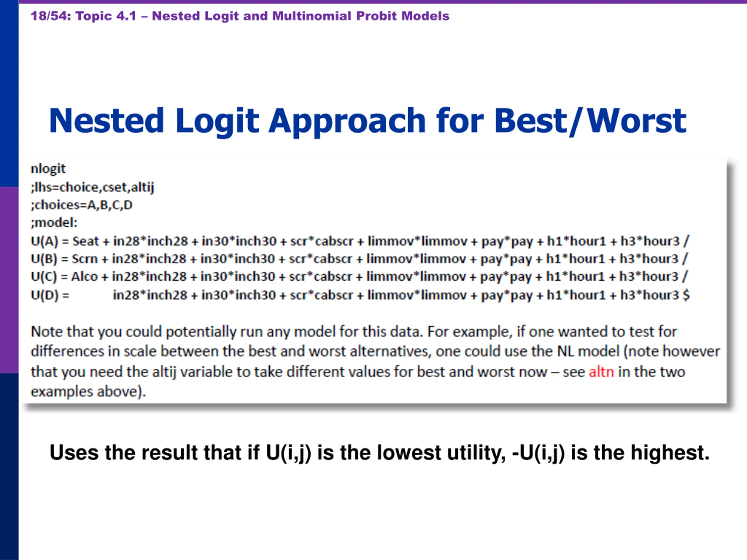 18/54: Topic 4.1 Nested Logit and Multinomial Probit Models Nested Logit Approach for Best/Worst Uses the result that if U(i,j) is the lowest utility, -U(i,j) is the highest.