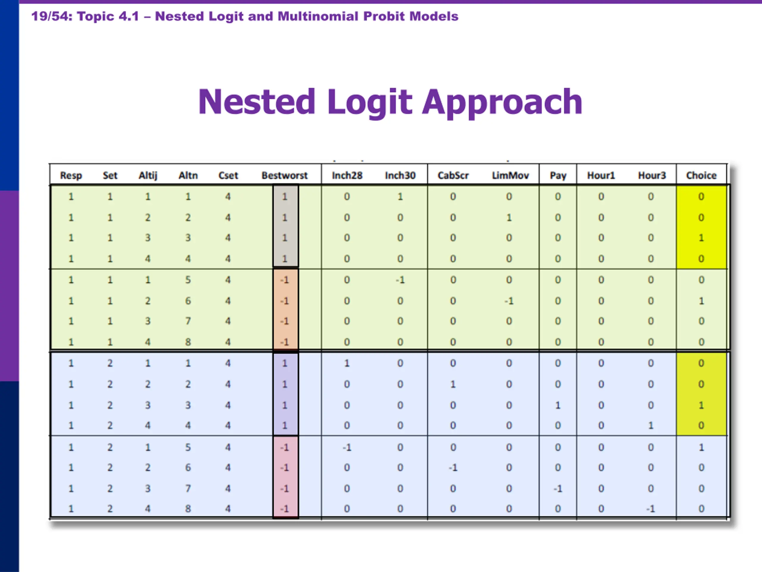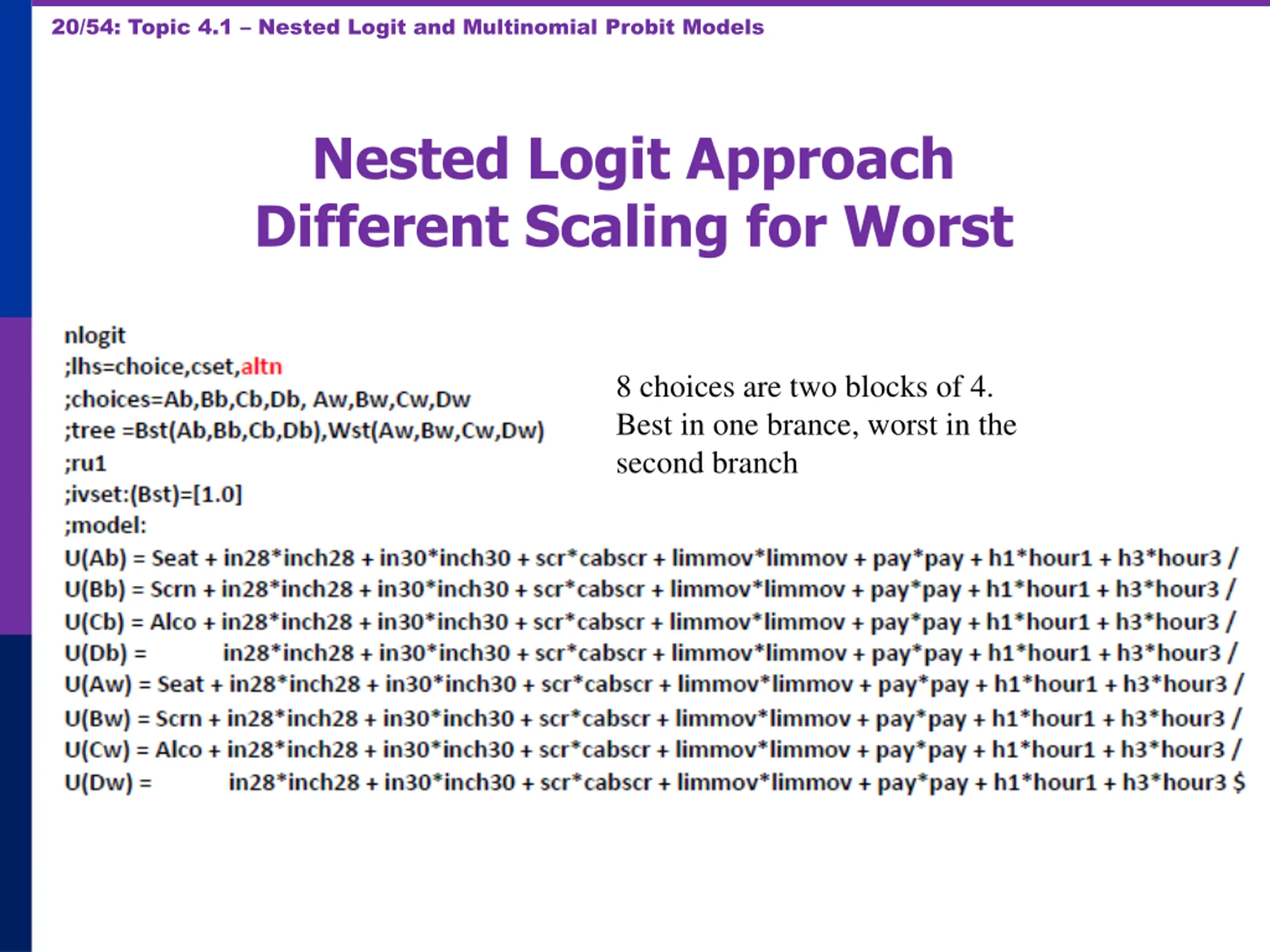 20/54: Topic 4.1 Nested Logit and Multinomial Probit Models Nested Logit Approach Different Scaling for Worst 8 choices are two blocks of 4. Best in one brance, worst in the second branch