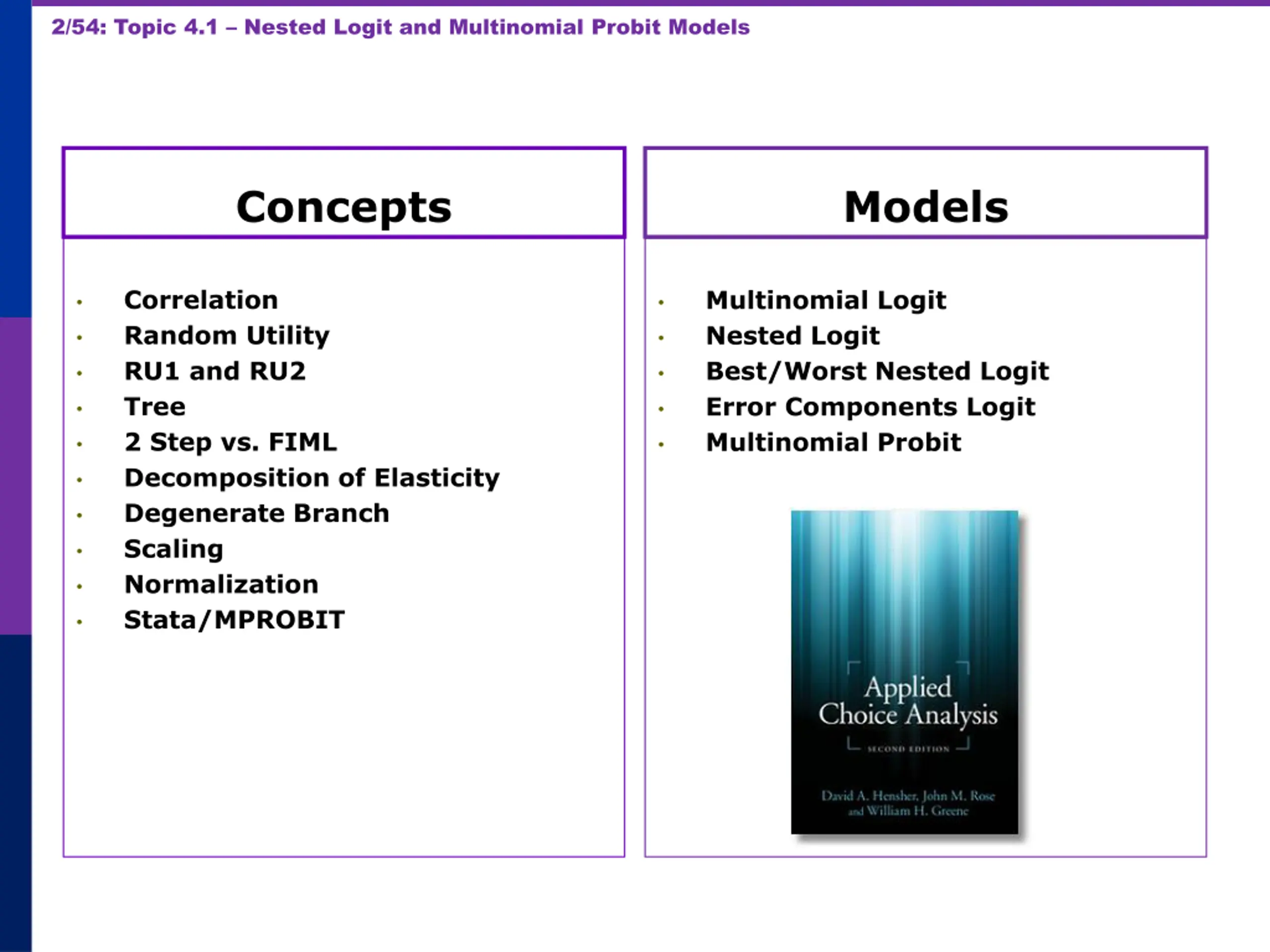2/54: Topic 4.1 Nested Logit and Multinomial Probit Models Concepts Models Correlation Random Utility RU1 and RU2 Tree 2 Step vs. FIML Decomposition of Elasticity Degenerate Branch Scaling Normalization Stata/MPROBIT Multinomial Logit Nested Logit Best/Worst Nested Logit Error Components Logit Multinomial Probit
