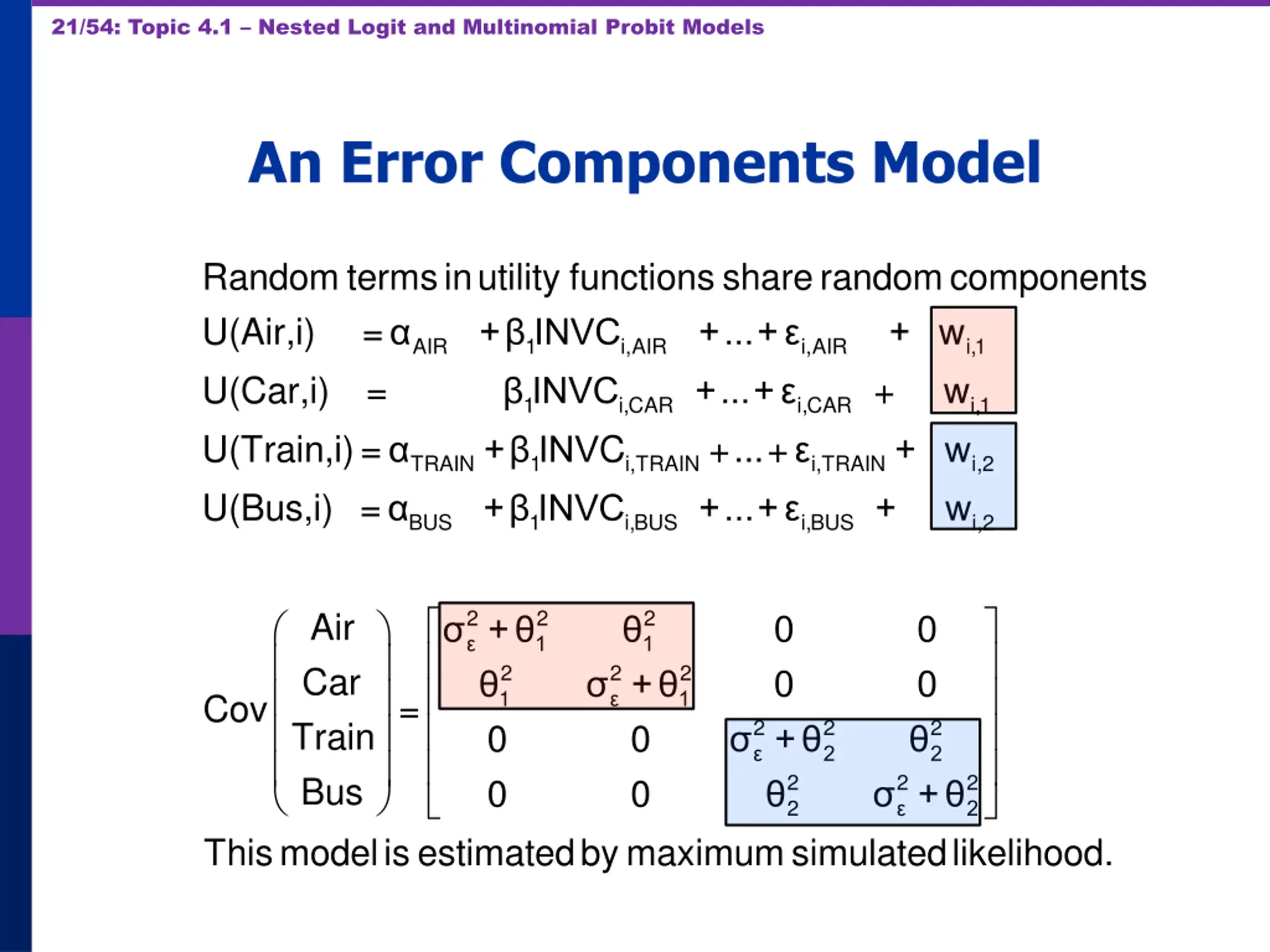 21/54: Topic 4.1 Nested Logit and Multinomial Probit Models An Error Components Model Random terms in utility functions share random components U(Air,i) = + INVC +...+ U(Car,i) = INVC U(Train,i)= + INV i,TRAIN U(Bus,i) = + INVC + w + w + w + w AIR 1 i,AIR i,AIR i,1 +...+ +...+ +...+ 1 i,CAR C i,CAR i,1 TRAIN 1 i,TRAIN i,2 BUS 1 i,BUS i,BUS i,2 Air Car Train Bus 2 2 1 2 1 + 0 0 0 0 0 0 2 1 2 2 1 + 0 0 Cov = 2 2 2 2 2 + 2 2 2 2 2 + This model is estimated by maximum simulated likelihood.