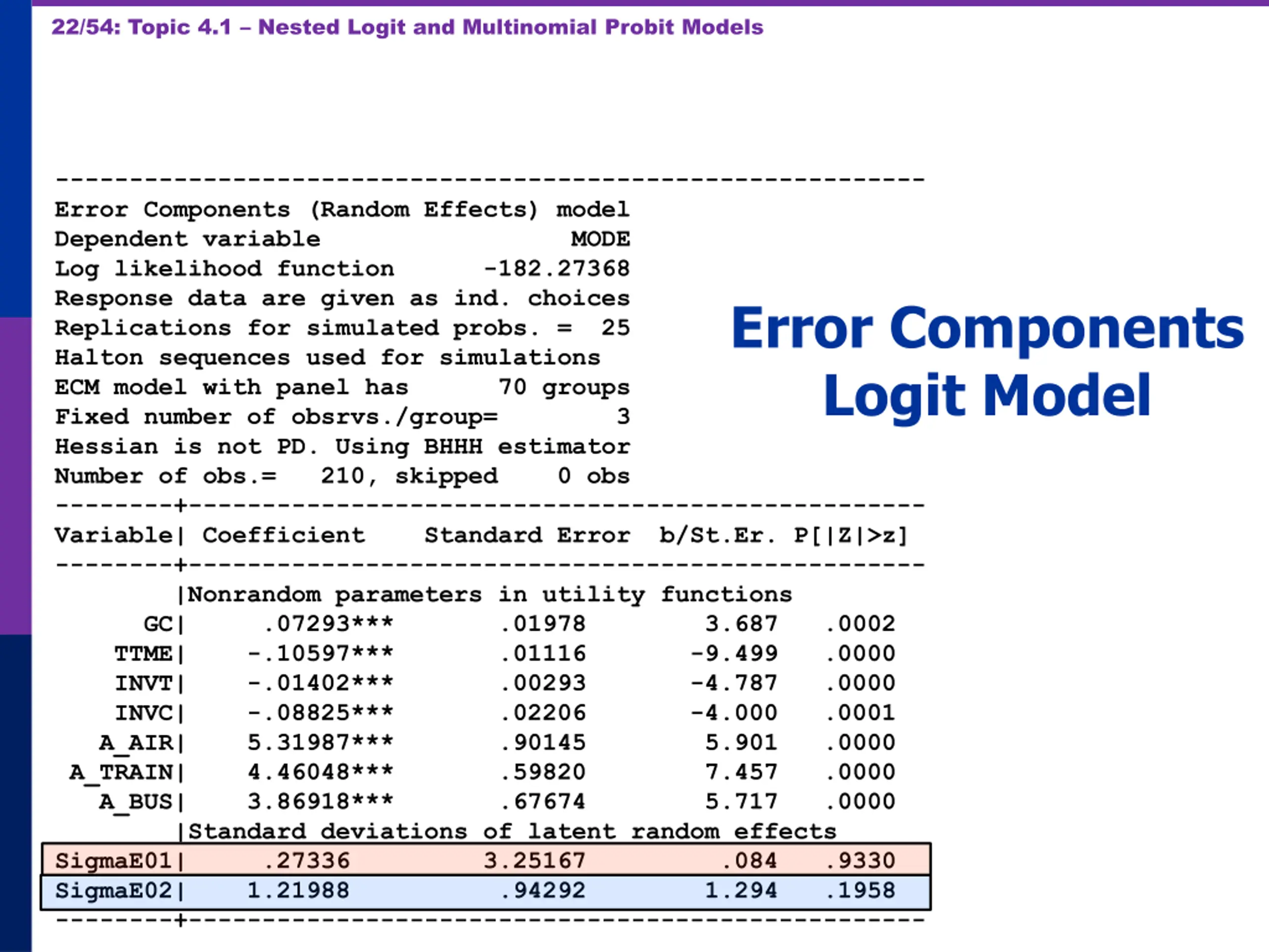 22/54: Topic 4.1 Nested Logit and Multinomial Probit Models ----------------------------------------------------------- Error Components (Random Effects) model Dependent variable MODE Log likelihood function -182.27368 Response data are given as ind. choices Replications for simulated probs. = 25 Halton sequences used for simulations ECM model with panel has 70 groups Fixed number of obsrvs./group= 3 Hessian is not PD. Using BHHH estimator Number of obs.= 210, skipped 0 obs --------+-------------------------------------------------- Variable| Coefficient Standard Error b/St.Er. P[|Z|>z] --------+-------------------------------------------------- |Nonrandom parameters in utility functions GC| .07293*** .01978 3.687 .0002 TTME| -.10597*** .01116 -9.499 .0000 INVT| -.01402*** .00293 -4.787 .0000 INVC| -.08825*** .02206 -4.000 .0001 A_AIR| 5.31987*** .90145 5.901 .0000 A_TRAIN| 4.46048*** .59820 7.457 .0000 A_BUS| 3.86918*** .67674 5.717 .0000 |Standard deviations of latent random effects SigmaE01| .27336 3.25167 .084 .9330 SigmaE02| 1.21988 .94292 1.294 .1958 --------+-------------------------------------------------- Error Components Logit Model