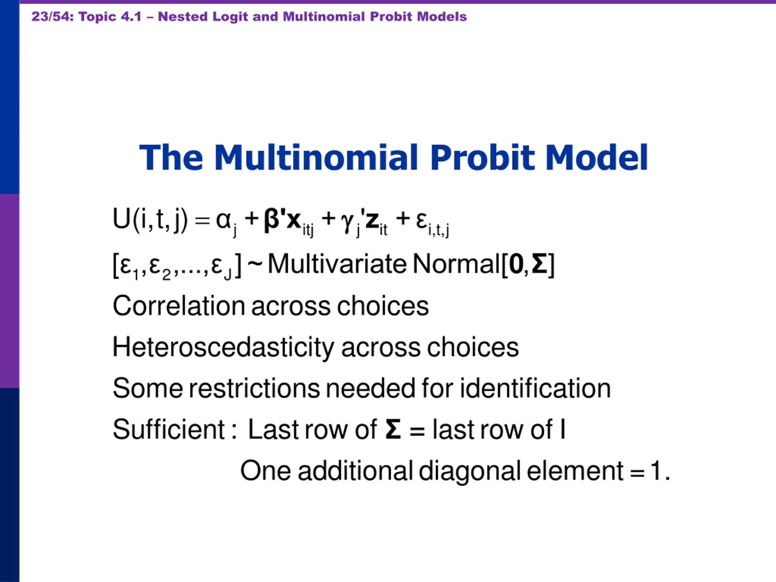 23/54: Topic 4.1 Nested Logit and Multinomial Probit Models The Multinomial Probit Model = + ' U(i,t,j) [ , ,..., ]~Multivariate Normal[ , ] Correlation across choices Heteroscedasticity across choices Some restrictions needed for identification Sufficient: Last row of One additional diagonal element = 1. + 'x z + j itj j it i,t,j 0 1 2 J = last row of I