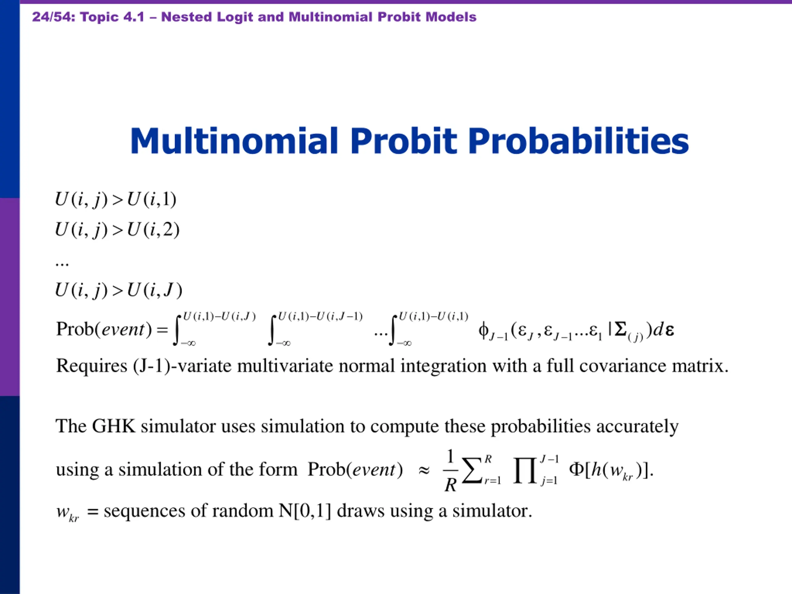 24/54: Topic 4.1 Nested Logit and Multinomial Probit Models Multinomial Probit Probabilities ( , ) ( , ) U i j ( ,1) ( ,2) U i U i j U i ... U i j ( , ) ( , ) U i J ( ,1) ( , ) U i J ( ,1) ( , 1) ( ,1) ( ,1) U i U i U i J U i U i = J Prob( ) ... ( , ... | ) event d 1 1 1 ( ) j J J Requires (J-1)-variate multivariate normal integration with a full c ovariance matrix. The GHK simulator uses simulation to compute these probabilities accurately 1 R 1 R J using a simulation of the form Prob( ) [ ( h w )]. event kr = = 1 1 r j = sequences of random N[0,1] draw s using a simulator. w kr