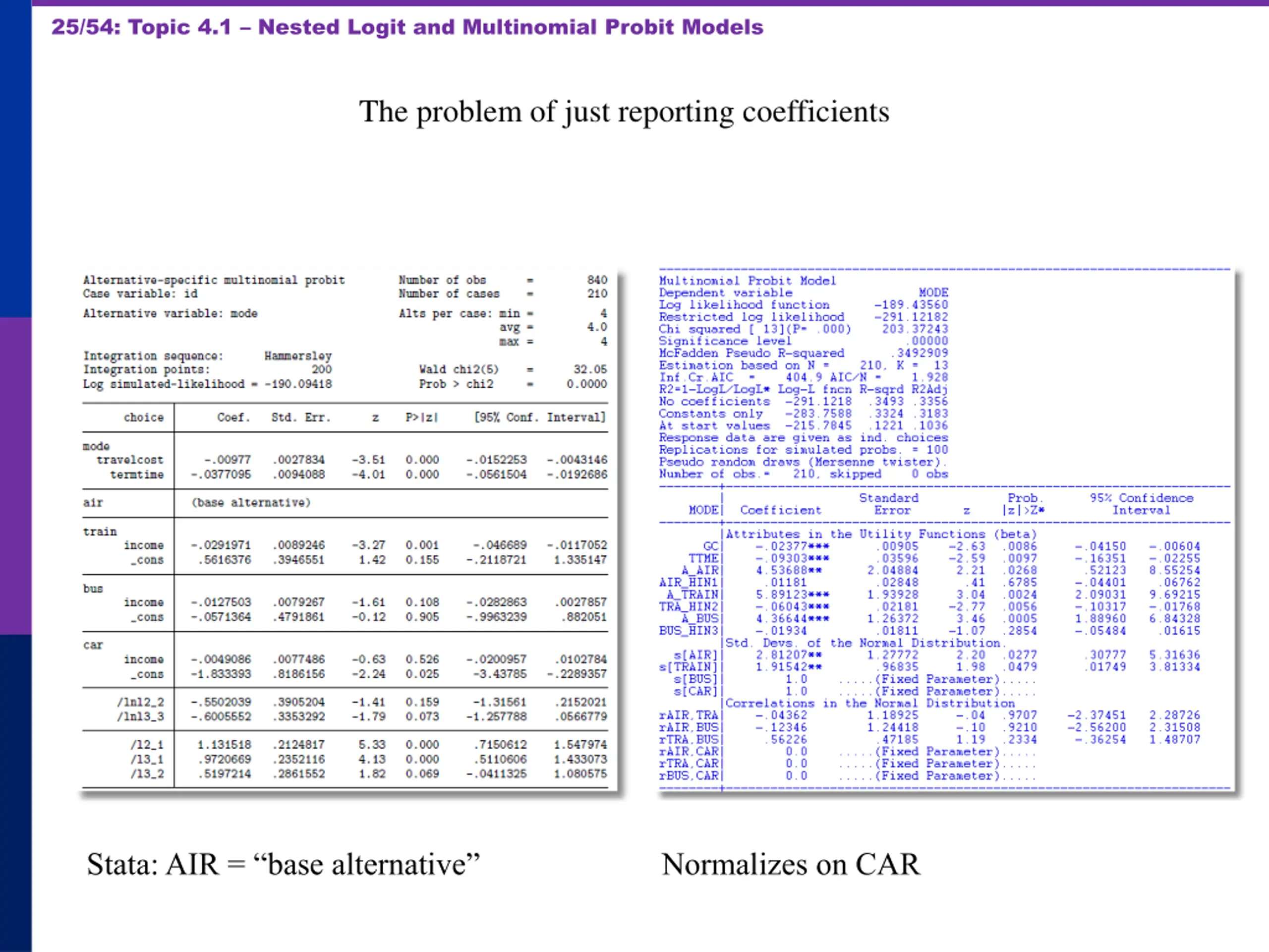 25/54: Topic 4.1 Nested Logit and Multinomial Probit Models The problem of just reporting coefficients Stata: AIR = base alternative Normalizes on CAR
