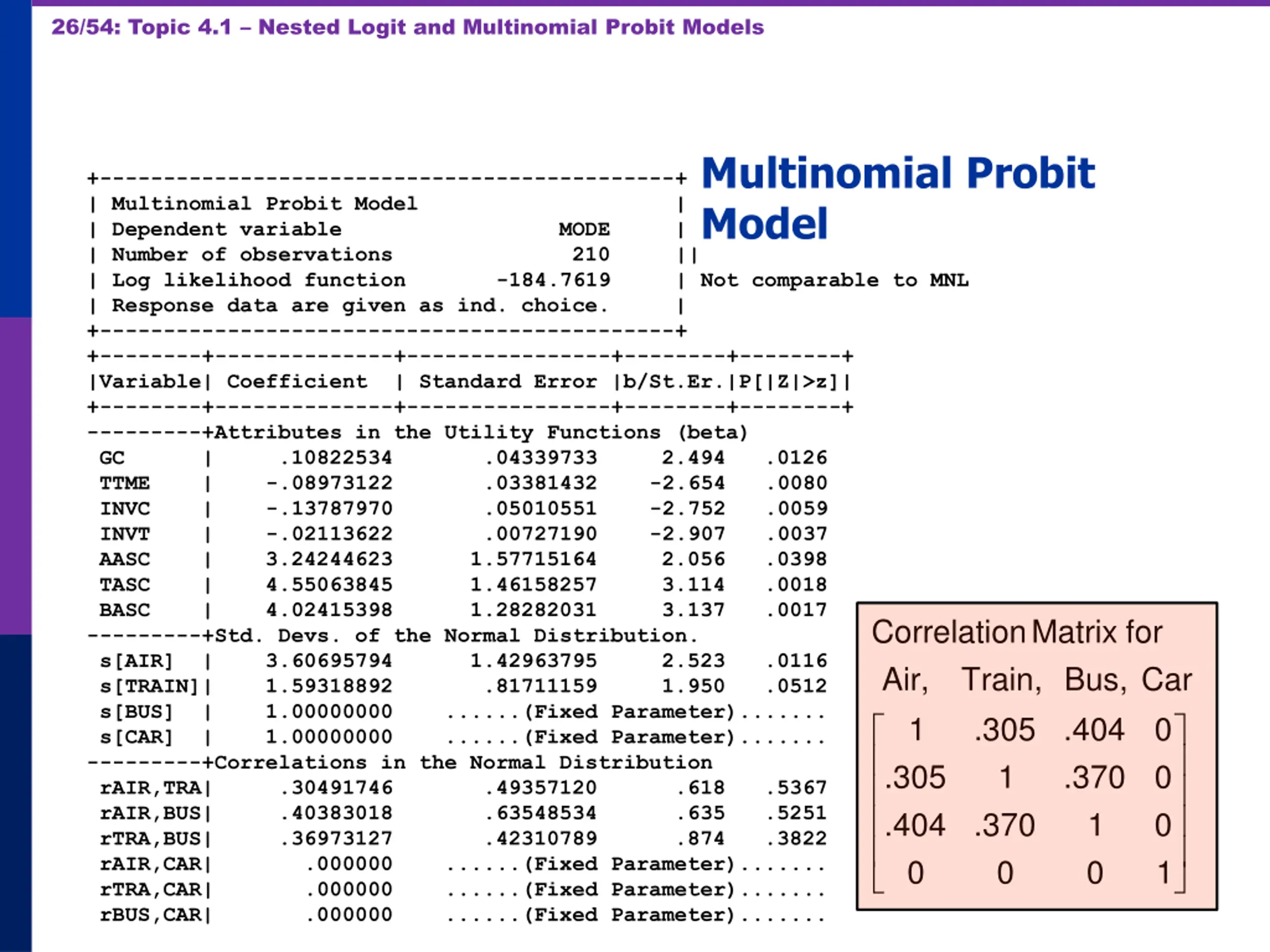 26/54: Topic 4.1 Nested Logit and Multinomial Probit Models Multinomial Probit Model +---------------------------------------------+ | Multinomial Probit Model | | Dependent variable MODE | | Number of observations 210 || | Log likelihood function -184.7619 | Not comparable to MNL | Response data are given as ind. choice. | +---------------------------------------------+ +--------+--------------+----------------+--------+--------+ |Variable| Coefficient | Standard Error |b/St.Er.|P[|Z|>z]| +--------+--------------+----------------+--------+--------+ ---------+Attributes in the Utility Functions (beta) GC | .10822534 .04339733 2.494 .0126 TTME | -.08973122 .03381432 -2.654 .0080 INVC | -.13787970 .05010551 -2.752 .0059 INVT | -.02113622 .00727190 -2.907 .0037 AASC | 3.24244623 1.57715164 2.056 .0398 TASC | 4.55063845 1.46158257 3.114 .0018 BASC | 4.02415398 1.28282031 3.137 .0017 ---------+Std. Devs. of the Normal Distribution. s[AIR] | 3.60695794 1.42963795 2.523 .0116 s[TRAIN]| 1.59318892 .81711159 1.950 .0512 s[BUS] | 1.00000000 ......(Fixed Parameter)....... s[CAR] | 1.00000000 ......(Fixed Parameter)....... ---------+Correlations in the Normal Distribution rAIR,TRA| .30491746 .49357120 .618 .5367 rAIR,BUS| .40383018 .63548534 .635 .5251 rTRA,BUS| .36973127 .42310789 .874 .3822 rAIR,CAR| .000000 ......(Fixed Parameter)....... rTRA,CAR| .000000 ......(Fixed Parameter)....... rBUS,CAR| .000000 ......(Fixed Parameter)....... Correlation Matrix for Air, Train, Bus, Car 1 .305 .404 .305 1 .404 .370 0 0 0 0 0 1 .370 1 0