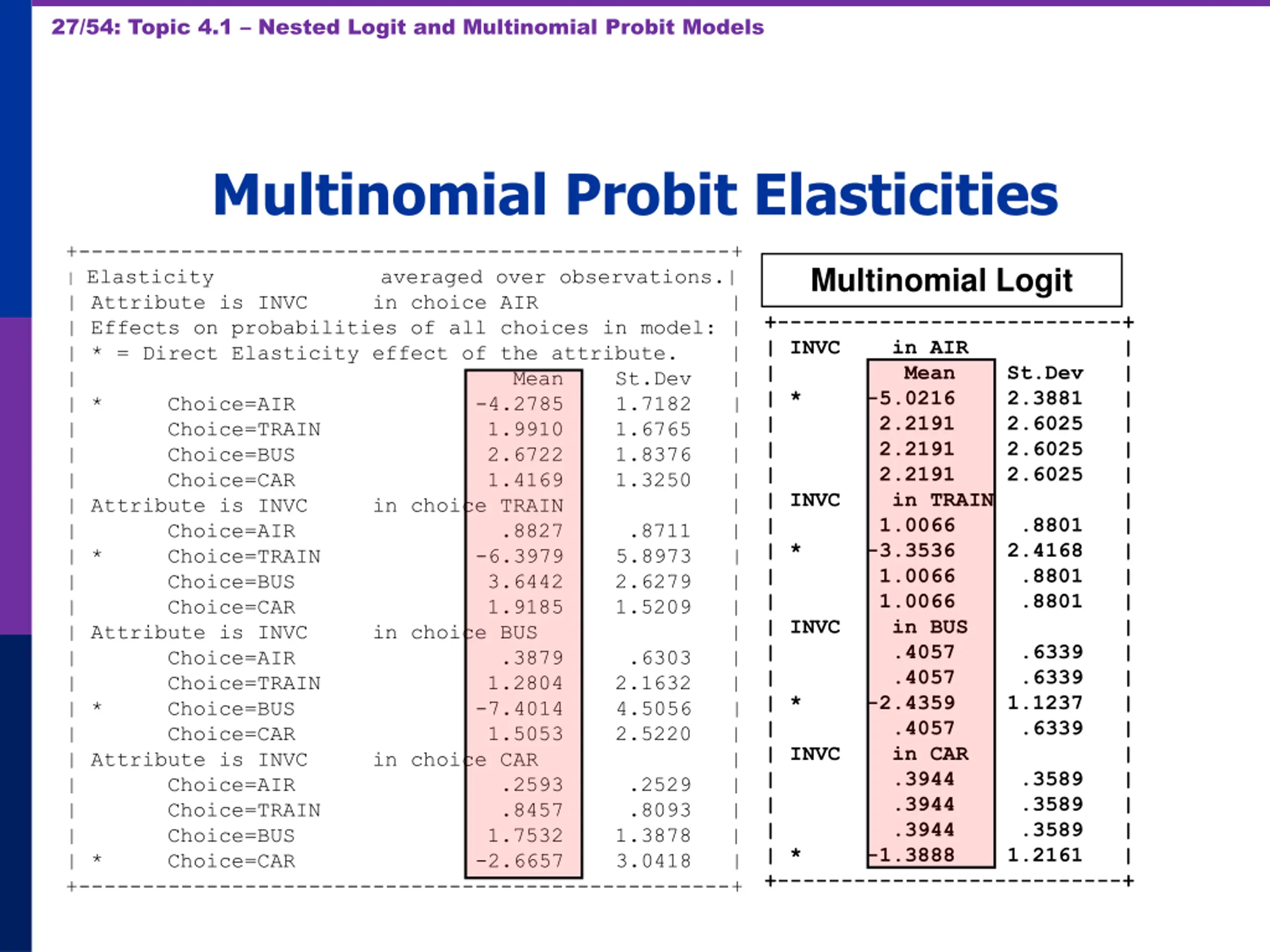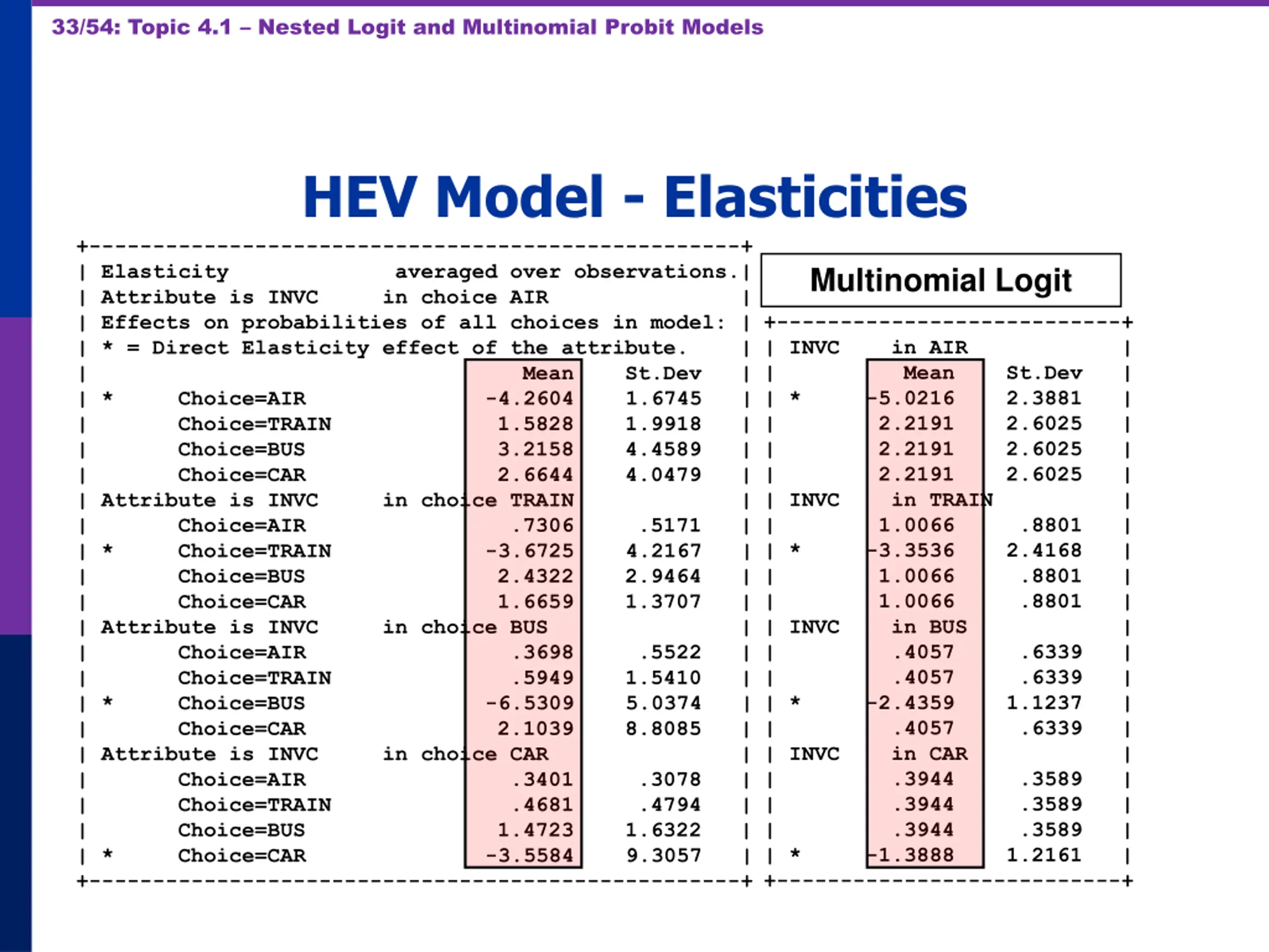 33/54: Topic 4.1 Nested Logit and Multinomial Probit Models HEV Model - Elasticities +---------------------------------------------------+ | Elasticity averaged over observations.| | Attribute is INVC in choice AIR | | Effects on probabilities of all choices in model: | | * = Direct Elasticity effect of the attribute. | | Mean St.Dev | | * Choice=AIR -4.2604 1.6745 | | Choice=TRAIN 1.5828 1.9918 | | Choice=BUS 3.2158 4.4589 | | Choice=CAR 2.6644 4.0479 | | Attribute is INVC in choice TRAIN | | Choice=AIR .7306 .5171 | | * Choice=TRAIN -3.6725 4.2167 | | Choice=BUS 2.4322 2.9464 | | Choice=CAR 1.6659 1.3707 | | Attribute is INVC in choice BUS | | Choice=AIR .3698 .5522 | | Choice=TRAIN .5949 1.5410 | | * Choice=BUS -6.5309 5.0374 | | Choice=CAR 2.1039 8.8085 | | Attribute is INVC in choice CAR | | Choice=AIR .3401 .3078 | | Choice=TRAIN .4681 .4794 | | Choice=BUS 1.4723 1.6322 | | * Choice=CAR -3.5584 9.3057 | +---------------------------------------------------+ Multinomial Logit +---------------------------+ | INVC in AIR | | Mean St.Dev | | * -5.0216 2.3881 | | 2.2191 2.6025 | | 2.2191 2.6025 | | 2.2191 2.6025 | | INVC in TRAIN | | 1.0066 .8801 | | * -3.3536 2.4168 | | 1.0066 .8801 | | 1.0066 .8801 | | INVC in BUS | | .4057 .6339 | | .4057 .6339 | | * -2.4359 1.1237 | | .4057 .6339 | | INVC in CAR | | .3944 .3589 | | .3944 .3589 | | .3944 .3589 | | * -1.3888 1.2161 | +---------------------------+