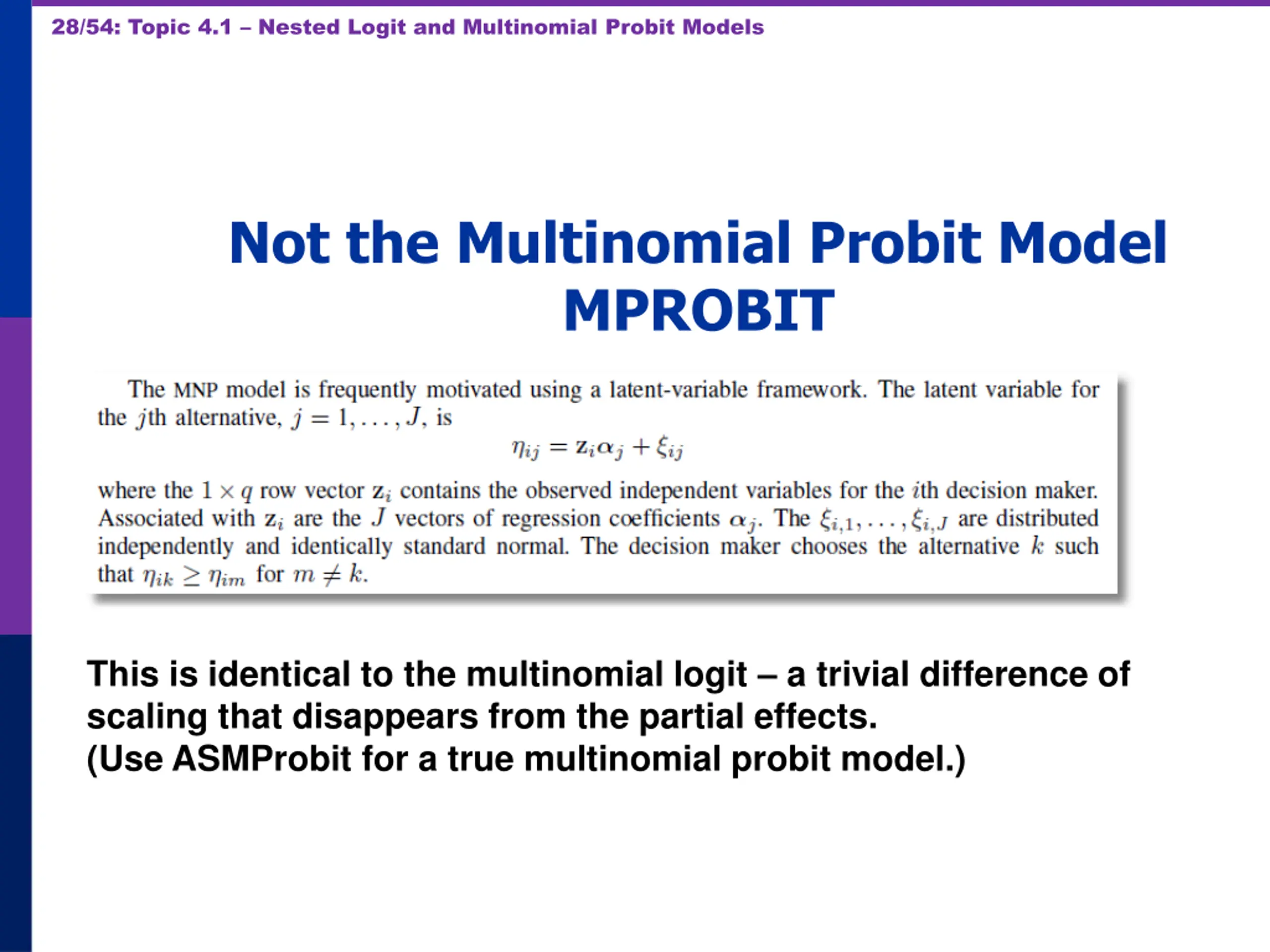 28/54: Topic 4.1 Nested Logit and Multinomial Probit Models Not the Multinomial Probit Model MPROBIT This is identical to the multinomial logit a trivial difference of scaling that disappears from the partial effects. (Use ASMProbit for a true multinomial probit model.)