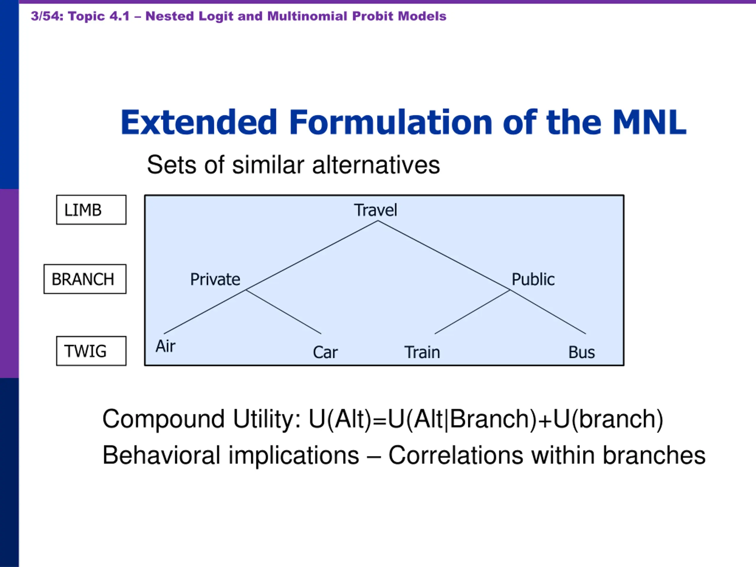 3/54: Topic 4.1 Nested Logit and Multinomial Probit Models Extended Formulation of the MNL Sets of similar alternatives LIMB Travel BRANCH Private Public Air TWIG Car Train Bus Compound Utility: U(Alt)=U(Alt|Branch)+U(branch) Behavioral implications Correlations within branches