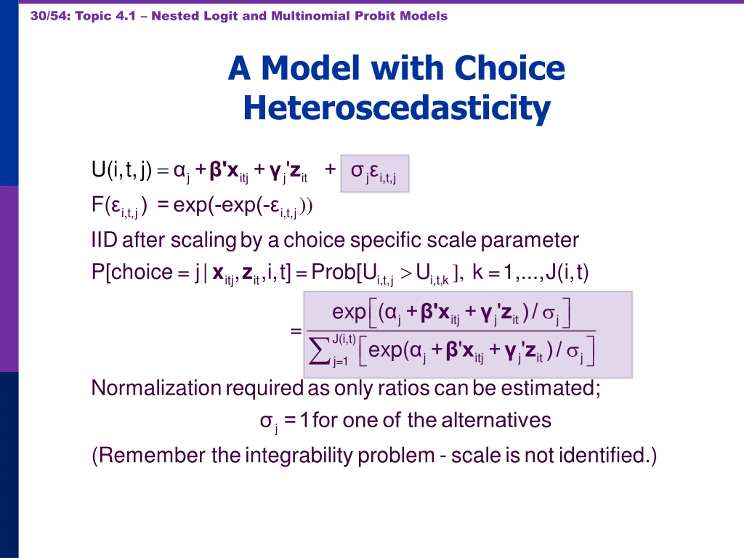 30/54: Topic 4.1 Nested Logit and Multinomial Probit Models A Model with Choice Heteroscedasticity = U( i ,t,j) + 'x + ' + z j itj j it j i,t,j F( IID after scaling by a choice specific scale parameter P[choice = j| , ,i,t] = Prob[U x z )) ) =exp(-exp(- i,t,j i,t,j U k = 1,...,J(i,t ) ], itj it i,t,j exp( + ' i,t,k exp ( + 'x + z ' )/ j itj j it j = J(i,t) x + z ' )/ j itj j it j j=1 Normalization required as only ratios can be estimated; =1 for one of the alternativ (Remember the integrability problem - scale is not identified.) es j