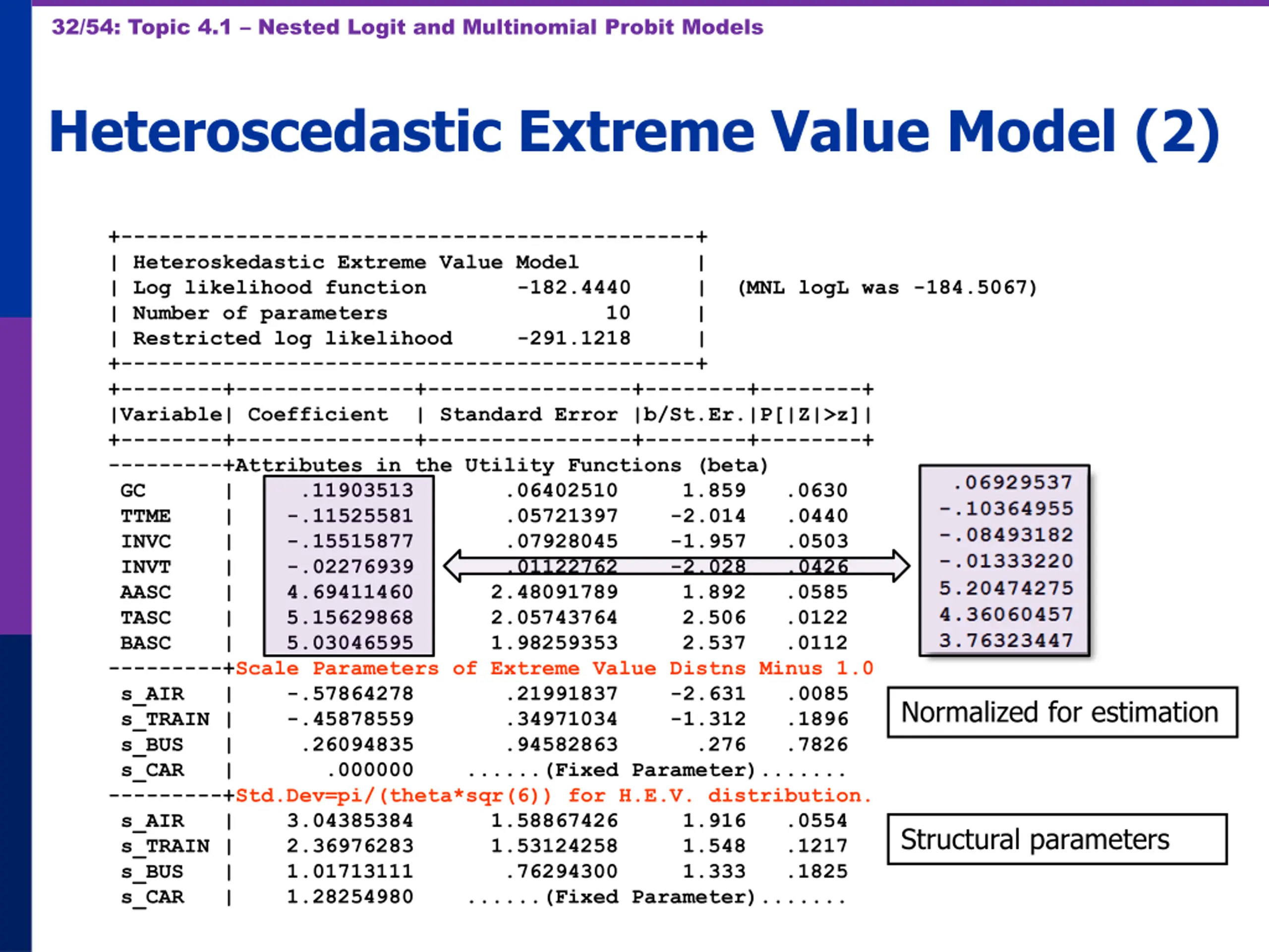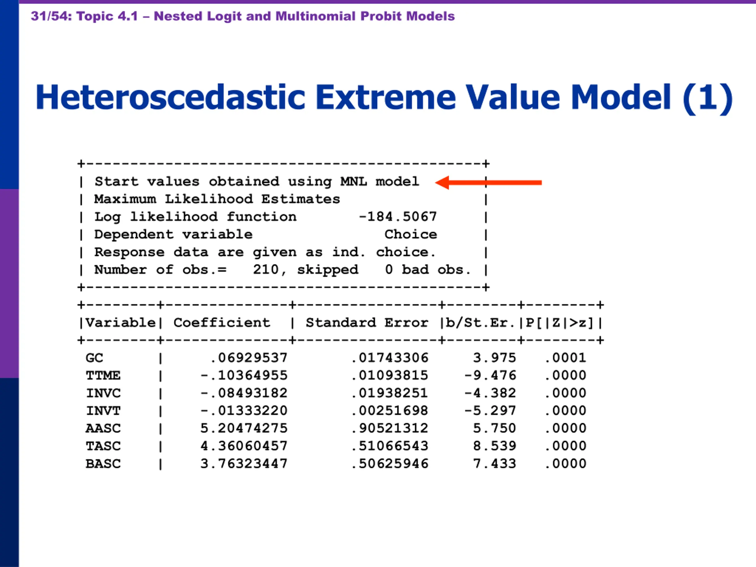 31/54: Topic 4.1 Nested Logit and Multinomial Probit Models Heteroscedastic Extreme Value Model (1) +---------------------------------------------+ | Start values obtained using MNL model | | Maximum Likelihood Estimates | | Log likelihood function -184.5067 | | Dependent variable Choice | | Response data are given as ind. choice. | | Number of obs.= 210, skipped 0 bad obs. | +---------------------------------------------+ +--------+--------------+----------------+--------+--------+ |Variable| Coefficient | Standard Error |b/St.Er.|P[|Z|>z]| +--------+--------------+----------------+--------+--------+ GC | .06929537 .01743306 3.975 .0001 TTME | -.10364955 .01093815 -9.476 .0000 INVC | -.08493182 .01938251 -4.382 .0000 INVT | -.01333220 .00251698 -5.297 .0000 AASC | 5.20474275 .90521312 5.750 .0000 TASC | 4.36060457 .51066543 8.539 .0000 BASC | 3.76323447 .50625946 7.433 .0000